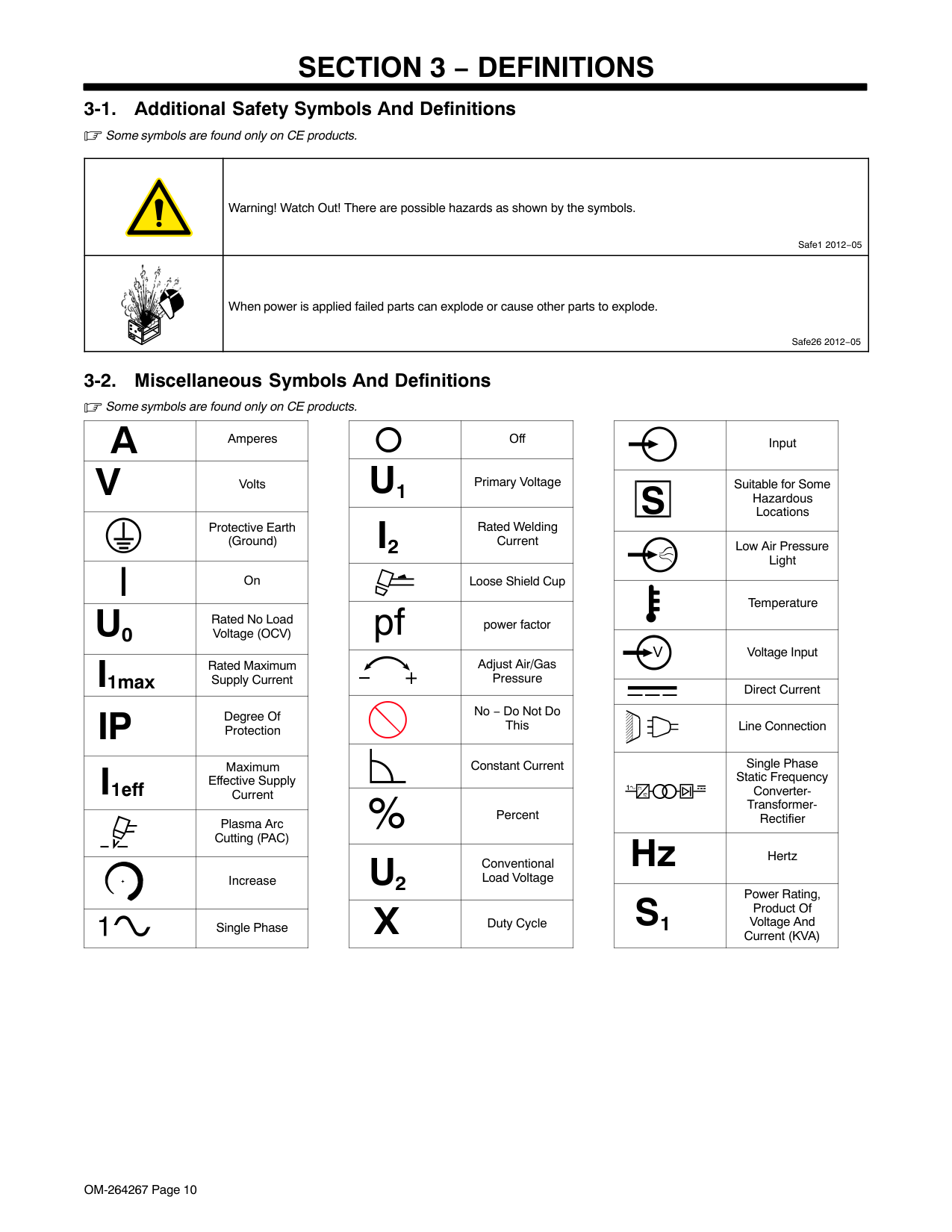 3-1. Additional Safety Symbols And Definitions Some symbols are found only on CE products. Warning! Watch Out! There are possible hazards as shown by the symbols. Safe1 2012−05 When power is applied failed parts can explode or cause other parts to explode. Safe26 2012−05 3-2. Miscellaneous Symbols And Definitions Some symbols are found only on CE products.A
