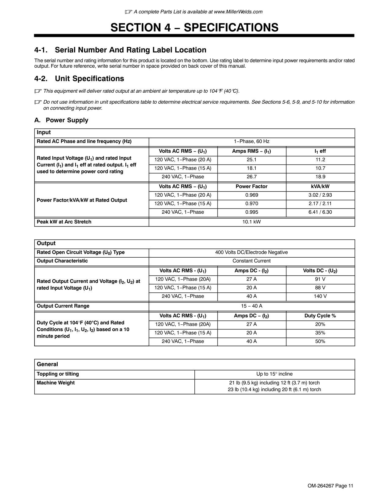 11 . . . . . . . . . . . . . . . . . . . . . . . . . . . . . . . . . . . . . . . . . . . . . . . . . . . . . . . . . . . . . . 4-1. Serial Number And Rating Label Location 11 . . . . . . . . . . . . . . . . . . . . . . . . . . . . . . . . . . . . . . . . . . . . . . . . 4-2. Unit Specifications 11 . . . . . . . . . . . . . . . . . . . . . . . . . . . . . . . . . . . . . . . . . . . . . . . . . . . . . . . . . . . . . . . . . . . . 4-3. Torch Dimensions 13 . . . . . . . . . . . . . . . . . . . . . . . . . . . . . . . . . . . . . . . . . . . . . . . . . . . . . . . . . . . . . . . . . . . . 4-4. Power Source Dimensions And Weight 13 . . . . . . . . . . . . . . . . . . . . . . . . . . . . . . . . . . . . . . . . . . . . . . . . . . 4-5. Environmental Specifications 14 . . . . . . . . . . . . . . . . . . . . . . . . . . . . . . . . . . . . . . . . . . . . . . . . . . . . . . . . . . . 4-6. Duty Cycle And Overheating 14 . . . . . . . . . . . . . . . . . . . . . . . . . . . . . . . . . . . . . . . . . . . . . . . . . . . . . . . . . . .Section 5 − Installation