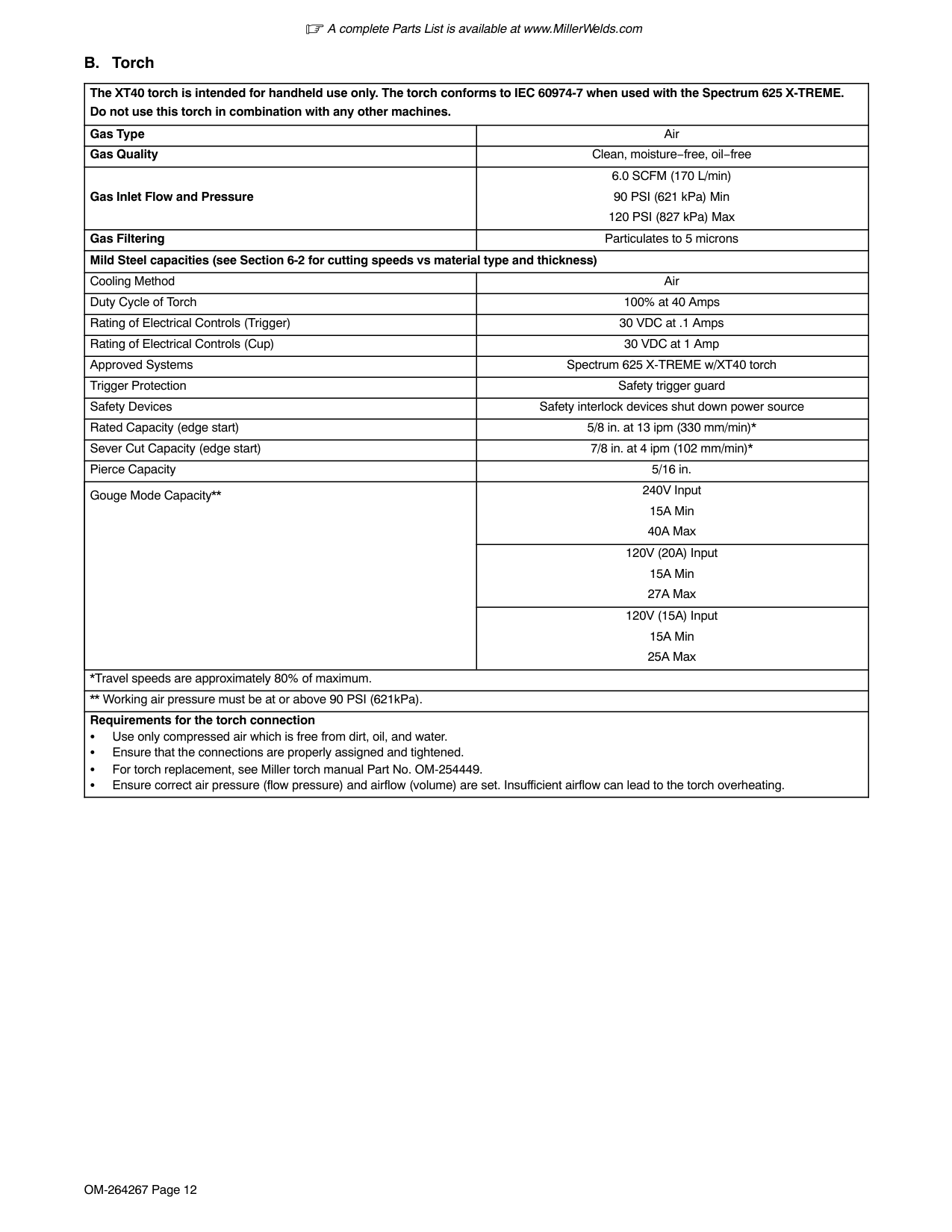 10-1. Recommended Spare Parts Description Part No. Dia. Mkgs. Item No. Recommended Spare Parts Quantity 269485 Cord Set, 250V 6-30P 10ga 3/C 12 ft St Jkt Locking 1 . . . . . . . . . . . . . . . . . . . . . . . . . . . . . . . . . . . . . . . 254330 Adapter, 5-15PXL630R 1 . . . . . . . . . . . . . . . . . . . . . . . . . . . . . . . . . . . . . . . . . . . . . . . . . . . . . . . . . . . . . . . . 254328 Adapter, 6-50PXL630R 1 . . . . . . . . . . . . . . . . . . . . . . . . . . . . . . . . . . . . . . . . . . . . . . . . . . . . . . . . . . . . . . . . 238486 Element, Filter Air 1 . . . . . . . . . . . . . . . . . . . . . . . . . . . . . . . . . . . . . . . . . . . . . . . . . . . . . . . . . . . . . . . . . . . . . 260633 XT40, 12 ft Hand Held Torch (Replacement) w/Quick Disconnect 1 . . . . . . . . . . . . . . . . . . . . . . . . . . . . 260635 XT40, 20 ft Hand Held Torch (Replacement) w/Quick Disconnect 1 . . . . . . . . . . . . . . . . . . . . . . . . . . . . 263799 Cable, Work 12 ft 12 ga w/200A Clamp & Plug 1 . . . . . . . . . . . . . . . . . . . . . . . . . . . . . . . . . . . . . . . . . . . . 254655 Label, XT40 Consumables 1 . . . . . . . . . . . . . . . . . . . . . . . . . . . . . . . . . . . . . . . . . . . . . . . . . . . . . . . . . . . . . 254331 Adapter, 5-20PXL630R 1 . . . . . . . . . . . . . . . . . . . . . . . . . . . . . . . . . . . . . . . . . . . . . . . . . . . . . . . . . . . . . . . . Ref. 254 655-B For extended tip use, set Amperage control to 40. For 30A machine cutting, use 249930 or 249933. 1 2 3 4 5 6 7 8 9 10 11 12 Figure 10-1. Consumable Parts For XT40 Description Part No. Dia. Mkgs. Item No. Figure 10-1. Consumable Parts For XT40 Quantity 1 251960 40A Drag Shield . . . . . . . . . . . . . . . . . . . . . . . . . . . . . . . . . . . . . . . . . . . . . . . . . . . . . . . . . . . . . . . . . . . . 2 249930 30A Drag Shield . . . . . . . . . . . . . . . . . . . . . . . . . . . . . . . . . . . . . . . . . . . . . . . . . . . . . . . . . . . . . . . . . . . . 3 249936 40A Gouge Shield . . . . . . . . . . . . . . . . . . . . . . . . . . . . . . . . . . . . . . . . . . . . . . . . . . . . . . . . . . . . . . . . . . 4 249333 30/40A Deflector . . . . . . . . . . . . . . . . . . . . . . . . . . . . . . . . . . . . . . . . . . . . . . . . . . . . . . . . . . . . . . . . . . . . 5 249932 30/40A Retaining Cup . . . . . . . . . . . . . . . . . . . . . . . . . . . . . . . . . . . . . . . . . . . . . . . . . . . . . . . . . . . . . . . 6 249928 40A Tip . . . . . . . . . . . . . . . . . . . . . . . . . . . . . . . . . . . . . . . . . . . . . . . . . . . . . . . . . . . . . . . . . . . . . . . . . . . . 7 249927 30A Tip . . . . . . . . . . . . . . . . . . . . . . . . . . . . . . . . . . . . . . . . . . . . . . . . . . . . . . . . . . . . . . . . . . . . . . . . . . . . 8 249934 40A Gouge Tip . . . . . . . . . . . . . . . . . . . . . . . . . . . . . . . . . . . . . . . . . . . . . . . . . . . . . . . . . . . . . . . . . . . . . 9 249931 30/40A Swirl Ring . . . . . . . . . . . . . . . . . . . . . . . . . . . . . . . . . . . . . . . . . . . . . . . . . . . . . . . . . . . . . . . . . . . 10 249926 30/40A Electrode . . . . . . . . . . . . . . . . . . . . . . . . . . . . . . . . . . . . . . . . . . . . . . . . . . . . . . . . . . . . . . . . . . . 11 249969 30/40A O-Ring . . . . . . . . . . . . . . . . . . . . . . . . . . . . . . . . . . . . . . . . . . . . . . . . . . . . . . . . . . . . . . . . . . . . . 12 249937 40A Machine Shield . . . . . . . . . . . . . . . . . . . . . . . . . . . . . . . . . . . . . . . . . . . . . . . . . . . . . . . . . . . . . . . . . To maintain the factory original performance of your equipment, use only Manufacturer’s Suggested Replacement Parts. Model is required when ordering parts from your local distributor. A complete Parts List is available on-line at www.MillerWelds.comOM-264267 Page 43 1 1 2 4 5 See Figure 10-1 for additional consumable parts. 3 6 Figure 10-2. Torch, XT40 Quick Disconnect Description Part No. Dia. Mkgs. Item No. Figure 10-2. Torch, XT40 Quick Disconnect Quantity 1 259870 Torch Handle Kit 1 . . . . . . . . . . . . . . . . . . . . . . . . . . . . . . . . . . . . . . . . . . . . . . . . . . . . . . . . . . . . . . . . . . . 2 249971 Torch Trigger 1 . . . . . . . . . . . . . . . . . . . . . . . . . . . . . . . . . . . . . . . . . . . . . . . . . . . . . . . . . . . . . . . . . . . . . . 3 260637 Leads, XT40 12ft Hand Held Torch w/Disconnect 1 . . . . . . . . . . . . . . . . . . . . . . . . . . . . . . . . . . . . . . . 3 260638 Leads, XT40 20ft Hand Held Torch w/Disconnect 1 . . . . . . . . . . . . . . . . . . . . . . . . . . . . . . . . . . . . . . . 4 252938 Torch Body Kit 1 . . . . . . . . . . . . . . . . . . . . . . . . . . . . . . . . . . . . . . . . . . . . . . . . . . . . . . . . . . . . . . . . . . . . . 5 249972 Torch Trigger Assembly w/Spring 1 . . . . . . . . . . . . . . . . . . . . . . . . . . . . . . . . . . . . . . . . . . . . . . . . . . . . 6 249973 Cup Detect Switch w/Screws 30-60Amp 1 . . . . . . . . . . . . . . . . . . . . . . . . . . . . . . . . . . . . . . . . . . . . . . 252951 Grease, Silicone 1 . . . . . . . . . . . . . . . . . . . . . . . . . . . . . . . . . . . . . . . . . . . . . . . . . . . . . . . . . . . . . . . . . . . . . . 260633 XT40, 12ft Hand Held Torch w/Disconnect Replacement 1 . . . . . . . . . . . . . . . . . . . . . . . . . . . . . . . . . . . 260635 XT40, 20ft Hand Held Torch w/Disconnect Replacement 1 . . . . . . . . . . . . . . . . . . . . . . . . . . . . . . . . . . . A complete Parts List is available on-line at www.MillerWelds.com To maintain the factory original performance of your equipment, use only Manufacturer’s Suggested Replacement Parts. Model and serial number required when ordering parts from your local distributor.