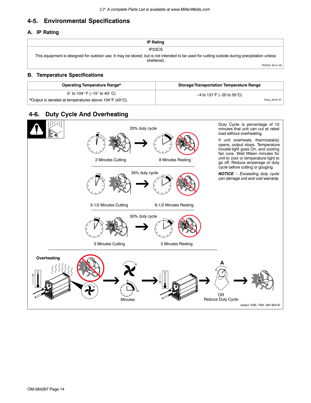 Temperature Specifications Operating Temperature Range* Storage/Transportation Temperature Range 5° to 104° F (−15° to 40° C) *Output is derated at temperatures above 104°F (40°C). −4 to 131°F (−20 to 55°C) Temp_2016- 07 4-6. Duty Cycle And Overheating Duty Cycle is percentage of 10 minutes that unit can cut at rated load without overheating. If unit overheats, thermostat(s) opens, output stops, Temperature trouble light goes On, and cooling fan runs. Wait fifteen minutes for unit to cool or temperature light to go off. Reduce amperage or duty cycle before cutting or gouging. NOTICE − Exceeding duty cycle can damage unit and void warranty. Overheating sduty1 5/95 / Ref. 264 954-B 5 Minutes Cutting 5 Minutes Resting 50% duty cycle 2 Minutes Cutting 8 Minutes Resting 3-1/2 Minutes Cutting 6-1/2 Minutes Resting 35% duty cycle 0 15 MinutesA