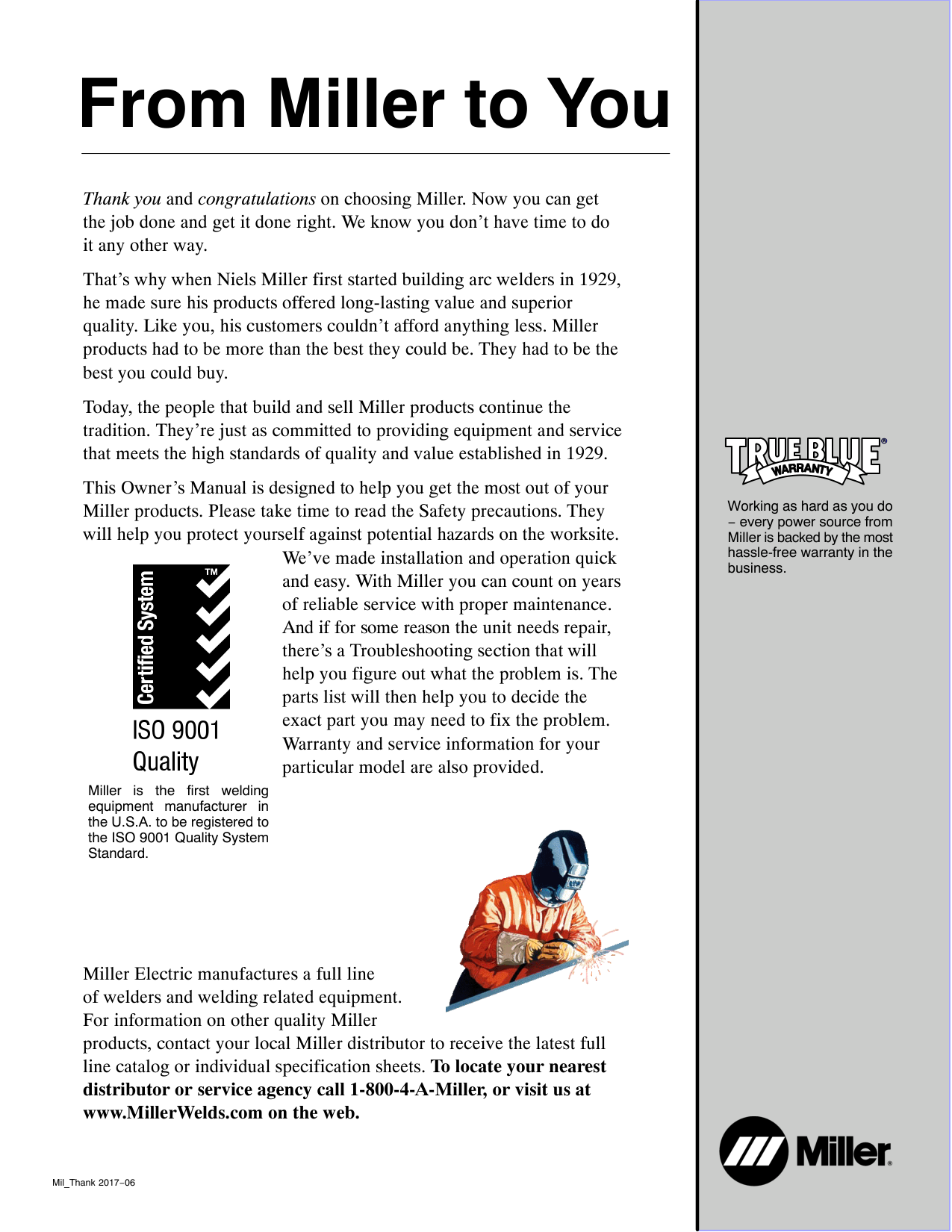 for your local Miller distributor. miller_warr 2018-01 Your distributor also gives you ... Service You always get the fast, reliable response you need. Most replacement parts can be in your hands in 24 hours. Support Need fast answers to the tough welding questions? Contact your distributor. The expertise of the distributor and Miller is there to help you, every step of the way.Original Instructions − Printed In Usa