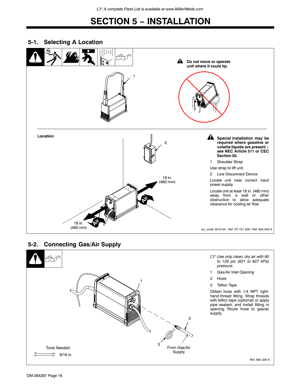! Special installation may be required where gasoline or volatile liquids are present − see NEC Article 511 or CEC Section 20. 1 Shoulder Strap Use strap to lift unit. 2 Line Disconnect Device Locate unit near correct input power supply. Locate unit at least 18 in. (460 mm) away from a wall or other obstruction to allow adequate clearance for cooling air flow. 5-1. Selecting A Location loc_small 2015-04 - Ref. ST-151 556 / Ref. 804 503-A Location 2 18 in. (460 mm) 18 in. (460 mm) ! Do not move or operate unit where it could tip. 1 5-2. Connecting Gas/Air Supply Ref. 805 326-A Use only clean, dry air with 90 to 120 psi (621 to 827 kPa) pressure. 1 Gas/Air Inlet Opening 2 Hose 3 Teflon Tape Obtain hose with 1/4 NPT right- hand thread fitting. Wrap threads with teflon tape (optional) or apply pipe sealant, and install fitting in opening. Route hose to gas/air supply. Tools Needed: 9/16 in. 3 From Gas/Air Supply 1 2A complete Parts List is available at www.MillerWelds.com OM-264267 Page 17 5-3. Connecting And Disconnecting Torch ! Turn off power source and disconnect input power. 1 Torch Connector 2 Quick Connect Collar 3 Receptacle To connect torch: Align torch connector key with receptacle keyway, and insert into receptacle. Rotate collar until it firmly snaps into the locked position. To disconnect torch: Rotate collar to release torch connector from receptacle and pull torch connector away from unit. Ref. 264 954-B 2 1 3 5-4. Connecting And Disconnecting Work Cable Ref. 264 954-B / Ref. 803 475-G ! Turn off power source and disconnect input power. 1 Work Cable Plug 2 Work Cable Receptacle To connect plug, align key with receptacle keyway and insert into receptacle. Rotate plug clockwise (hand tight only) 1/4 turn to secure in receptacle. To disconnect plug, rotate counter- clockwise until key aligns with key- way and pull plug from receptacle. 2 1