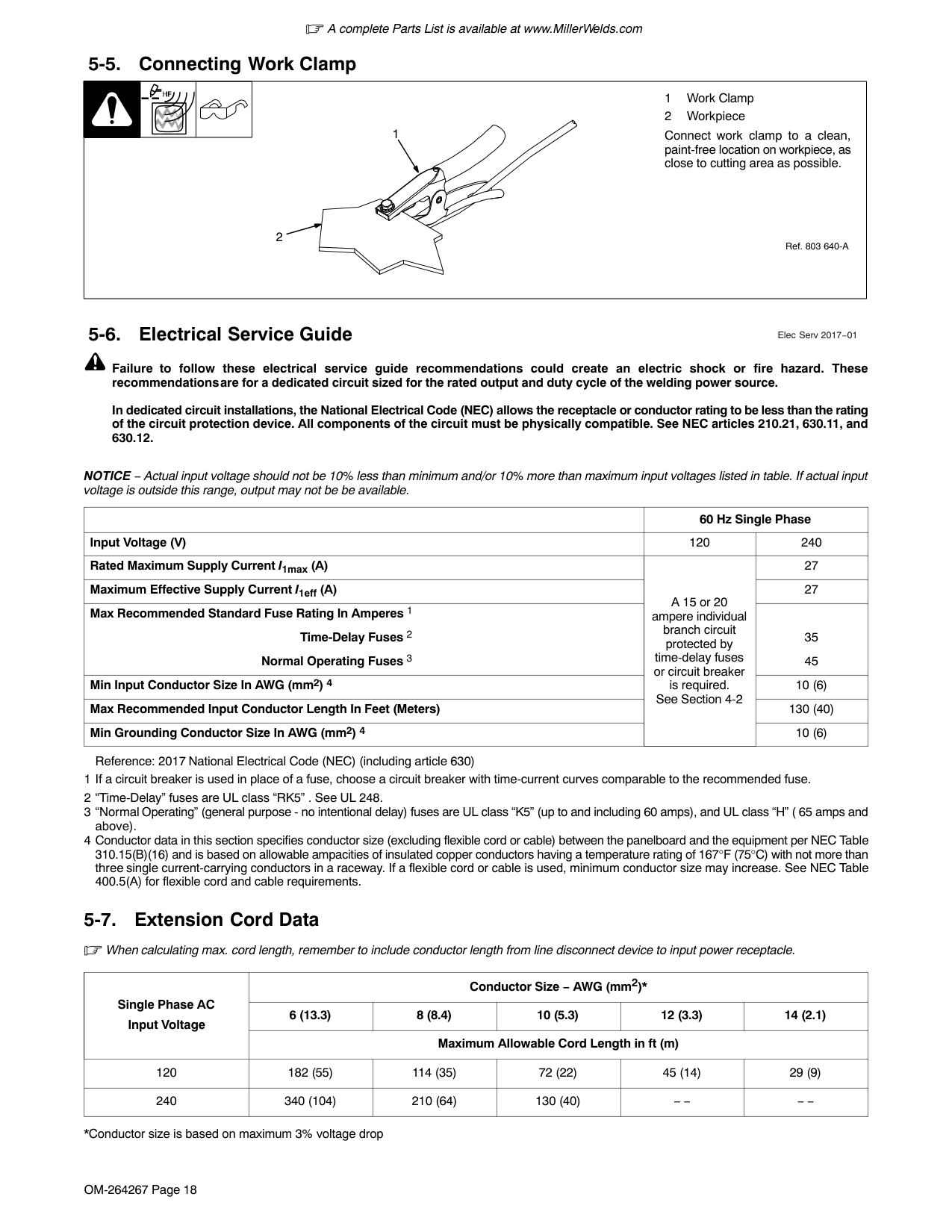 A complete Parts List is available at www.MillerWelds.com OM-264267 Page 18 5-5. Connecting Work Clamp Ref. 803 640-A 1 Work Clamp 2 Workpiece Connect work clamp to a clean, paint-free location on workpiece, as close to cutting area as possible. 1 2 5-6. Electrical Service Guide Elec Serv 2017−01 Failure to follow these electrical service guide recommendations could create an electric shock or fire hazard. These recommendations are for a dedicated circuit sized for the rated output and duty cycle of the welding power source. In dedicated circuit installations, the National Electrical Code (NEC) allows the receptacle or conductor rating to be less than the rating of the circuit protection device. All components of the circuit must be physically compatible. See NEC articles 210.21, 630.11, and 630.12. NOTICE − Actual input voltage should not be 10% less than minimum and/or 10% more than maximum input voltages listed in table. If actual input voltage is outside this range, output may not be be available. 60 Hz Single Phase Input Voltage (V) 120 240 Rated Maximum Supply Current I1max (A) A 15 or 20 ampere individual branch circuit protected by time-delay fuses or circuit breaker is required. See Section 4-2 27 Maximum Effective Supply Current I1eff (A) 27 Max Recommended Standard Fuse Rating In Amperes 1 Time-Delay Fuses 2 35 Normal Operating Fuses 3 45 Min Input Conductor Size In AWG (mm2) 4 10 (6) Max Recommended Input Conductor Length In Feet (Meters) 130 (40) Min Grounding Conductor Size In AWG (mm2) 4 10 (6) Reference: 2017 National Electrical Code (NEC) (including article 630) 1 If a circuit breaker is used in place of a fuse, choose a circuit breaker with time-current curves comparable to the recommended fuse. 2 “Time-Delay” fuses are UL class “RK5” . See UL 248. 3 “Normal Operating” (general purpose - no intentional delay) fuses are UL class “K5” (up to and including 60 amps), and UL class “H” ( 65 amps and above). 4 Conductor data in this section specifies conductor size (excluding flexible cord or cable) between the panelboard and the equipment per NEC Table 310.15(B)(16) and is based on allowable ampacities of insulated copper conductors having a temperature rating of 167°F (75°C) with not more than three single current-carrying conductors in a raceway. If a flexible cord or cable is used, minimum conductor size may increase. See NEC Table 400.5(A) for flexible cord and cable requirements. 5-7. Extension Cord Data When calculating max. cord length, remember to include conductor length from line disconnect device to input power receptacle. Single Phase AC Input Voltage Conductor Size − AWG (mm2)* 6 (13.3) 8 (8.4) 10 (5.3) 12 (3.3) 14 (2.1) Maximum Allowable Cord Length in ft (m) 120 182 (55) 114 (35) 72 (22) 45 (14) 29 (9) 240 340 (104) 210 (64) 130 (40) − − − − *Conductor size is based on maximum 3% voltage drop