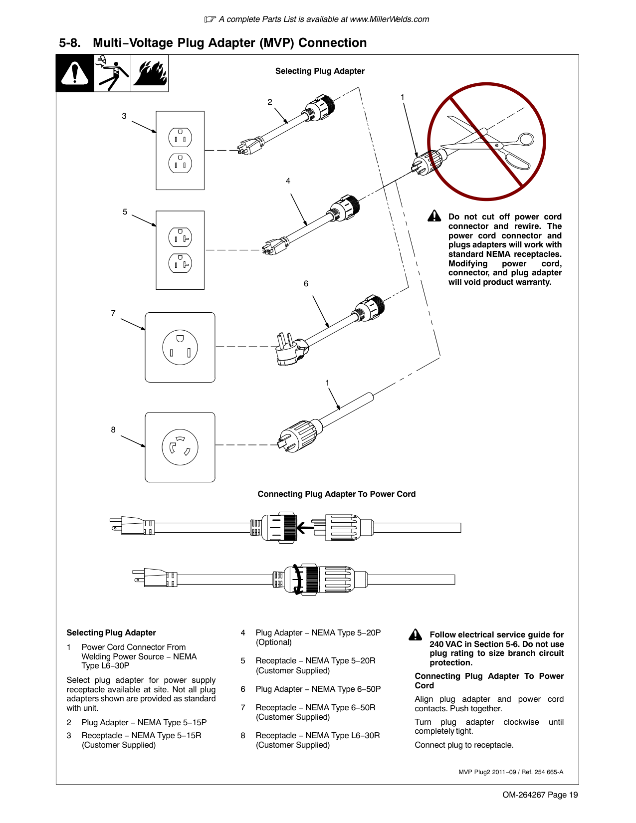 A complete Parts List is available at www.MillerWelds.com OM-264267 Page 19 5-8. Multi−Voltage Plug Adapter (MVP) Connection Selecting Plug Adapter 1 Power Cord Connector From Welding Power Source − NEMA Type L6−30P Select plug adapter for power supply receptacle available at site. Not all plug adapters shown are provided as standard with unit. 2 Plug Adapter − NEMA Type 5−15P 3 Receptacle − NEMA Type 5−15R (Customer Supplied) 4 Plug Adapter − NEMA Type 5−20P (Optional) 5 Receptacle − NEMA Type 5−20R (Customer Supplied) 6 Plug Adapter − NEMA Type 6−50P 7 Receptacle − NEMA Type 6−50R (Customer Supplied) 8 Receptacle − NEMA Type L6−30R (Customer Supplied) ! Follow electrical service guide for 240 VAC in Section 5-6. Do not use plug rating to size branch circuit protection. Connecting Plug Adapter To Power Cord Align plug adapter and power cord contacts. Push together. Turn plug adapter clockwise until completely tight. Connect plug to receptacle. MVP Plug2 2011−09 / Ref. 254 665-A ! Do not cut off power cord connector and rewire. The power cord connector and plugs adapters will work with standard NEMA receptacles. Modifying power cord, connector, and plug adapter will void product warranty. 3 2 7 4 5 6 1 Selecting Plug Adapter Connecting Plug Adapter To Power Cord 1 8