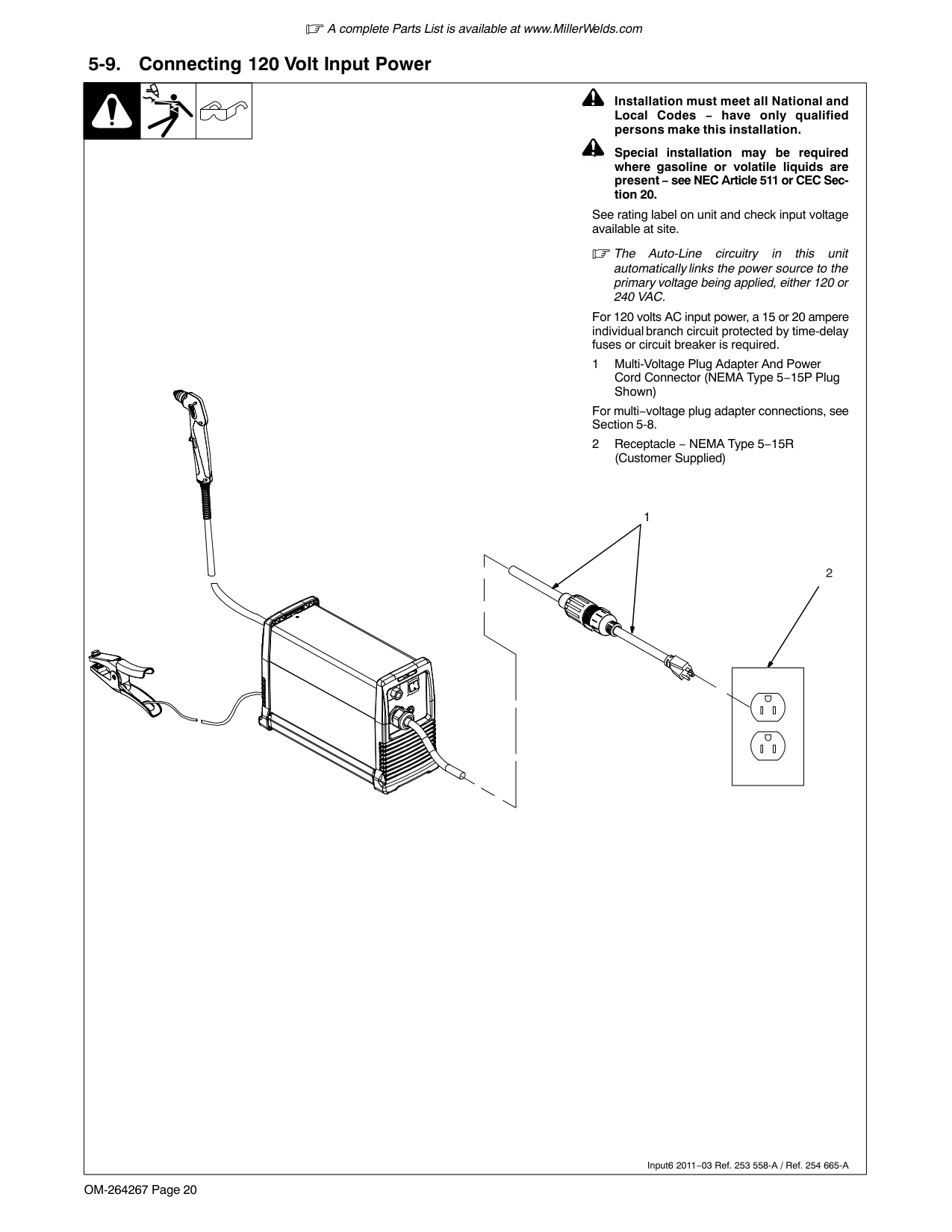 A complete Parts List is available at www.MillerWelds.com OM-264267 Page 20 Input6 2011−03 Ref. 253 558-A / Ref. 254 665-A 5-9. Connecting 120 Volt Input Power 1 ! Installation must meet all National and Local Codes − have only qualified persons make this installation. ! Special installation may be required where gasoline or volatile liquids are present − see NEC Article 511 or CEC Sec- tion 20. See rating label on unit and check input voltage available at site. The Auto-Line circuitry in this unit automatically links the power source to the primary voltage being applied, either 120 or