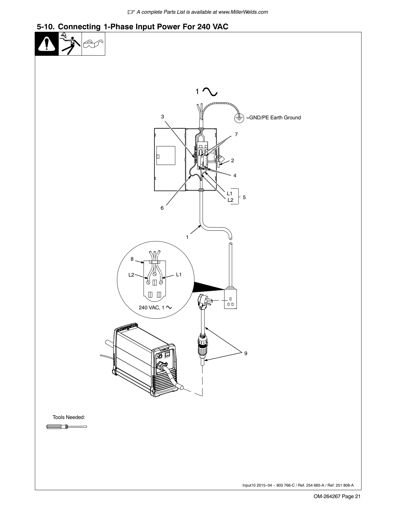 For 120 volts AC input power, a 15 or 20 ampere individual branch circuit protected by time-delay fuses or circuit breaker is required. 1 Multi-Voltage Plug Adapter And Power Cord Connector (NEMA Type 5−15P Plug Shown) For multi−voltage plug adapter connections, see Section 5-8. 2 Receptacle − NEMA Type 5−15R (Customer Supplied) 2A complete Parts List is available at www.MillerWelds.com OM-264267 Page 21 5-10. Connecting 1-Phase Input Power For 240 VAC Tools Needed: