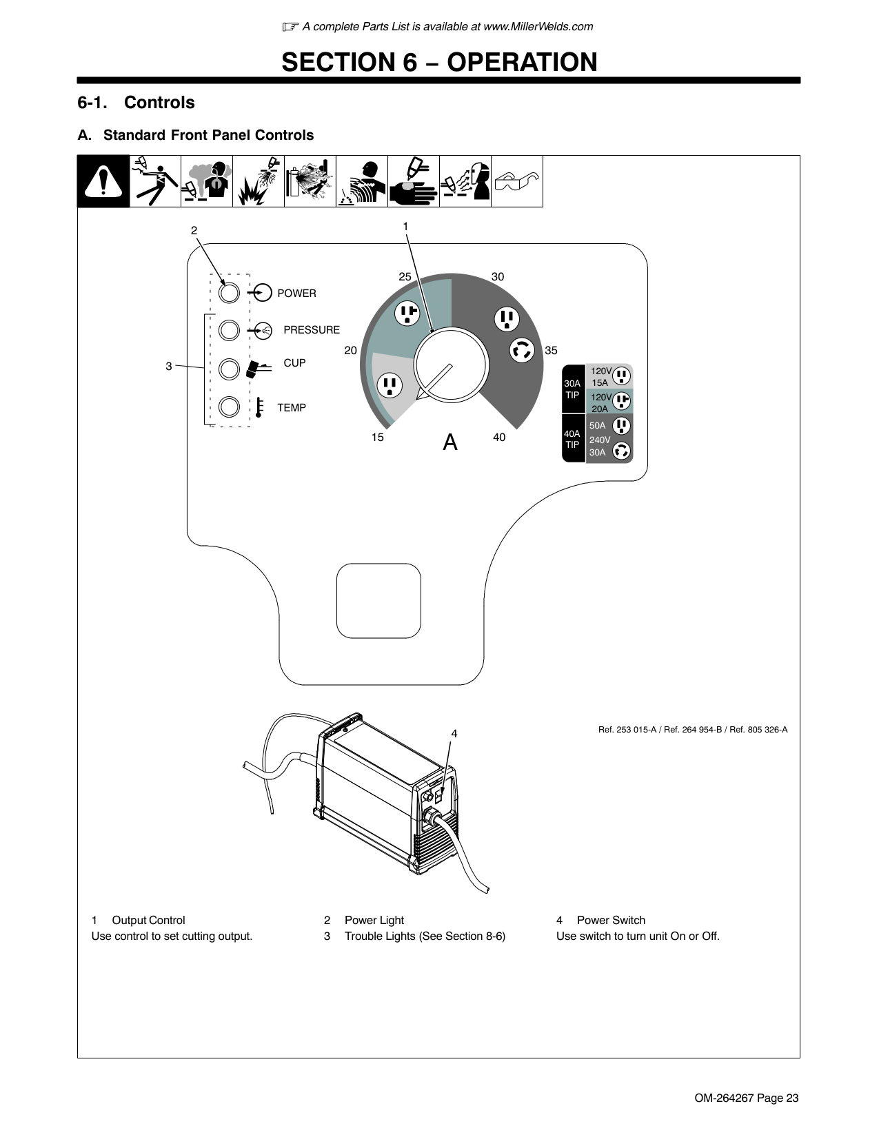 Standard Front Panel Controls 1 Output Control Use control to set cutting output. 2 Power Light 3 Trouble Lights (See Section 8-6) 4 Power Switch Use switch to turn unit On or Off. Ref. 253 015-A / Ref. 264 954-B / Ref. 805 326-AV