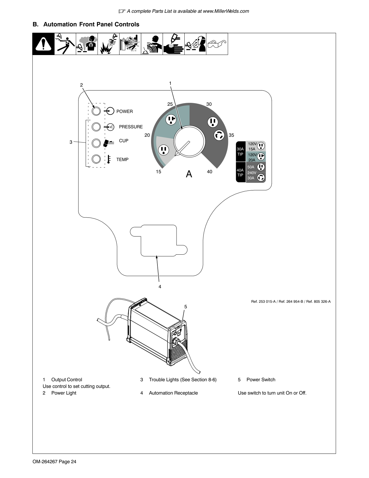 Automation Front Panel Controls 1 Output Control Use control to set cutting output. 2 Power Light 3 Trouble Lights (See Section 8-6) 4 Automation Receptacle 5 Power Switch Use switch to turn unit On or Off. Ref. 253 015-A / Ref. 264 954-B / Ref. 805 326-AV