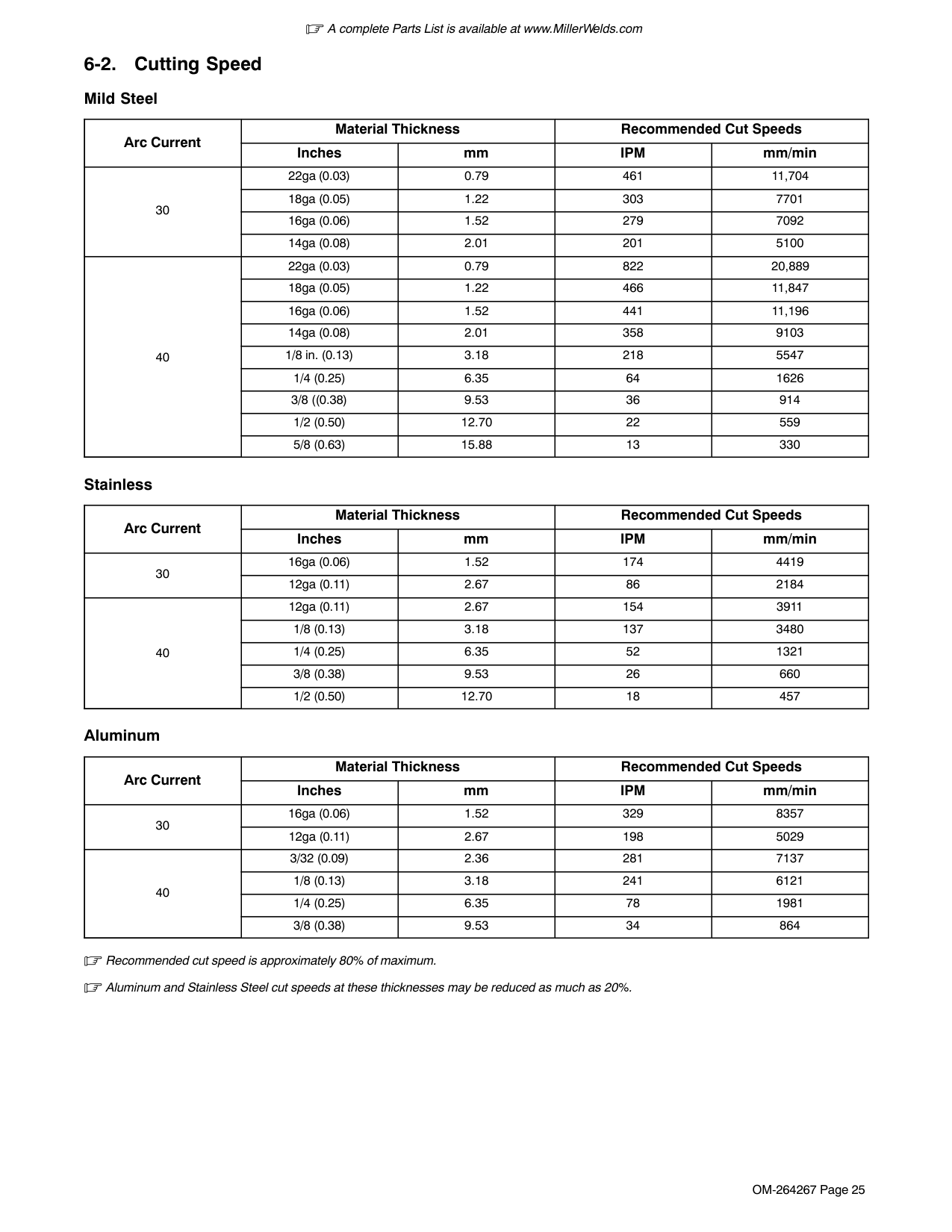 3 1 2 4 5A complete Parts List is available at www.MillerWelds.com OM-264267 Page 25 6-2. Cutting Speed Mild Steel Arc Current Material Thickness Recommended Cut Speeds Inches mm