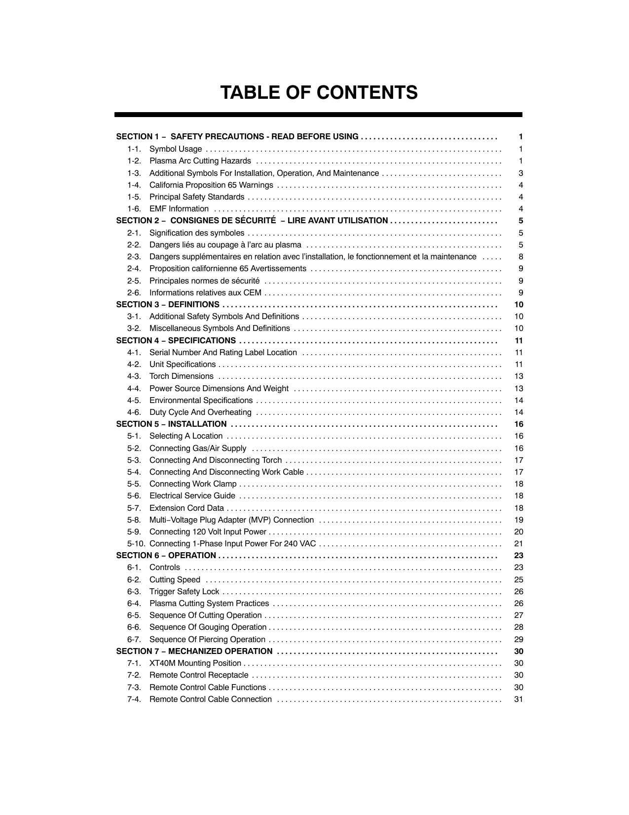 5 . . . . . . . . . . . . . . . . . . . . . . . . . . 2-1. Signification des symboles 5 . . . . . . . . . . . . . . . . . . . . . . . . . . . . . . . . . . . . . . . . . . . . . . . . . . . . . . . . . . . . . 2-2. Dangers liés au coupage à l’arc au plasma 5 . . . . . . . . . . . . . . . . . . . . . . . . . . . . . . . . . . . . . . . . . . . . . . . 2-3. Dangers supplémentaires en relation avec l’installation, le fonctionnement et la maintenance 8 . . . . . 2-4. Proposition californienne 65 Avertissements 9 . . . . . . . . . . . . . . . . . . . . . . . . . . . . . . . . . . . . . . . . . . . . . . 2-5. Principales normes de sécurité 9 . . . . . . . . . . . . . . . . . . . . . . . . . . . . . . . . . . . . . . . . . . . . . . . . . . . . . . . . . 2-6. Informations relatives aux CEM 9 . . . . . . . . . . . . . . . . . . . . . . . . . . . . . . . . . . . . . . . . . . . . . . . . . . . . . . . . .Section 3 − Definitions