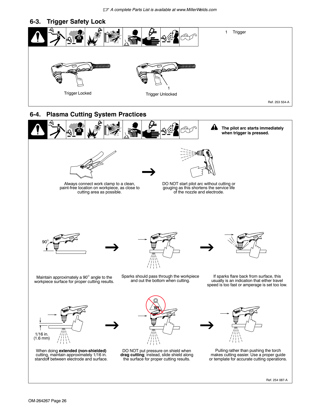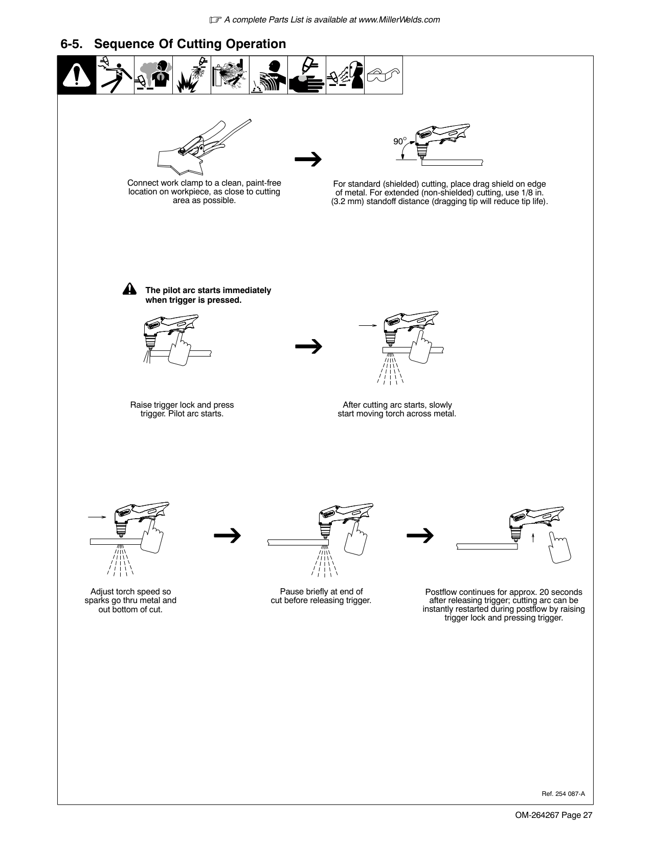 A complete Parts List is available at www.MillerWelds.com OM-264267 Page 27 out bottom of cut. Ref. 254 087-A 6-5. Sequence Of Cutting Operation After cutting arc starts, slowly start moving torch across metal. Adjust torch speed so sparks go thru metal and Pause briefly at end of cut before releasing trigger. Raise trigger lock and press trigger. Pilot arc starts. Postflow continues for approx. 20 seconds after releasing trigger; cutting arc can be instantly restarted during postflow by raising trigger lock and pressing trigger. ! The pilot arc starts immediately when trigger is pressed. For standard (shielded) cutting, place drag shield on edge of metal. For extended (non-shielded) cutting, use 1/8 in. (3.2 mm) standoff distance (dragging tip will reduce tip life). Connect work clamp to a clean, paint-free location on workpiece, as close to cutting area as possible. 90°