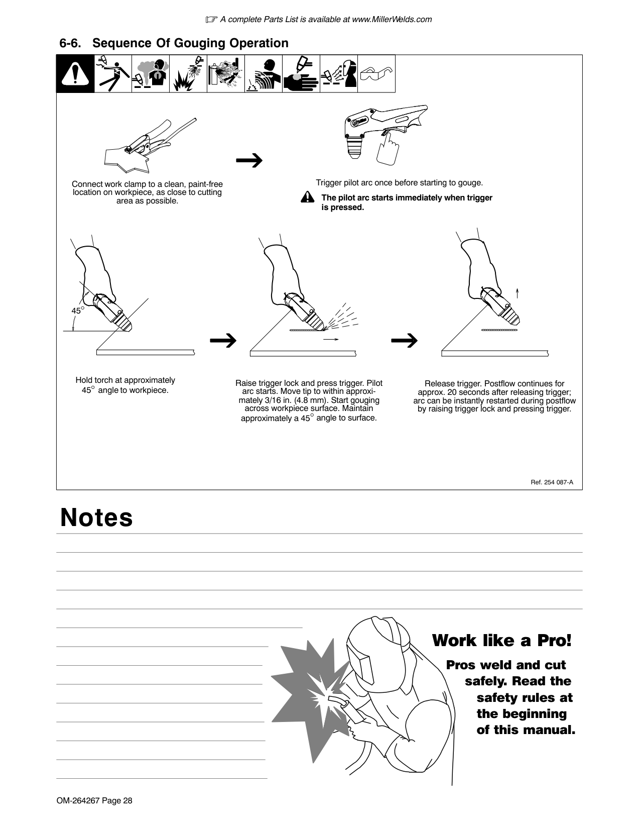 A complete Parts List is available at www.MillerWelds.com OM-264267 Page 28 Ref. 254 087-A 6-6. Sequence Of Gouging Operation Connect work clamp to a clean, paint-free location on workpiece, as close to cutting area as possible. Raise trigger lock and press trigger. Pilot arc starts. Move tip to within approxi- mately 3/16 in. (4.8 mm). Start gouging across workpiece surface. Maintain approximately a 45° angle to surface. Release trigger. Postflow continues for approx. 20 seconds after releasing trigger; arc can be instantly restarted during postflow by raising trigger lock and pressing trigger. Hold torch at approximately 45° angle to workpiece. Trigger pilot arc once before starting to gouge. ! The pilot arc starts immediately when trigger is pressed. 45° Notes Work like a Pro! Pros weld and cut safely. Read the safety rules at the beginning of this manual.