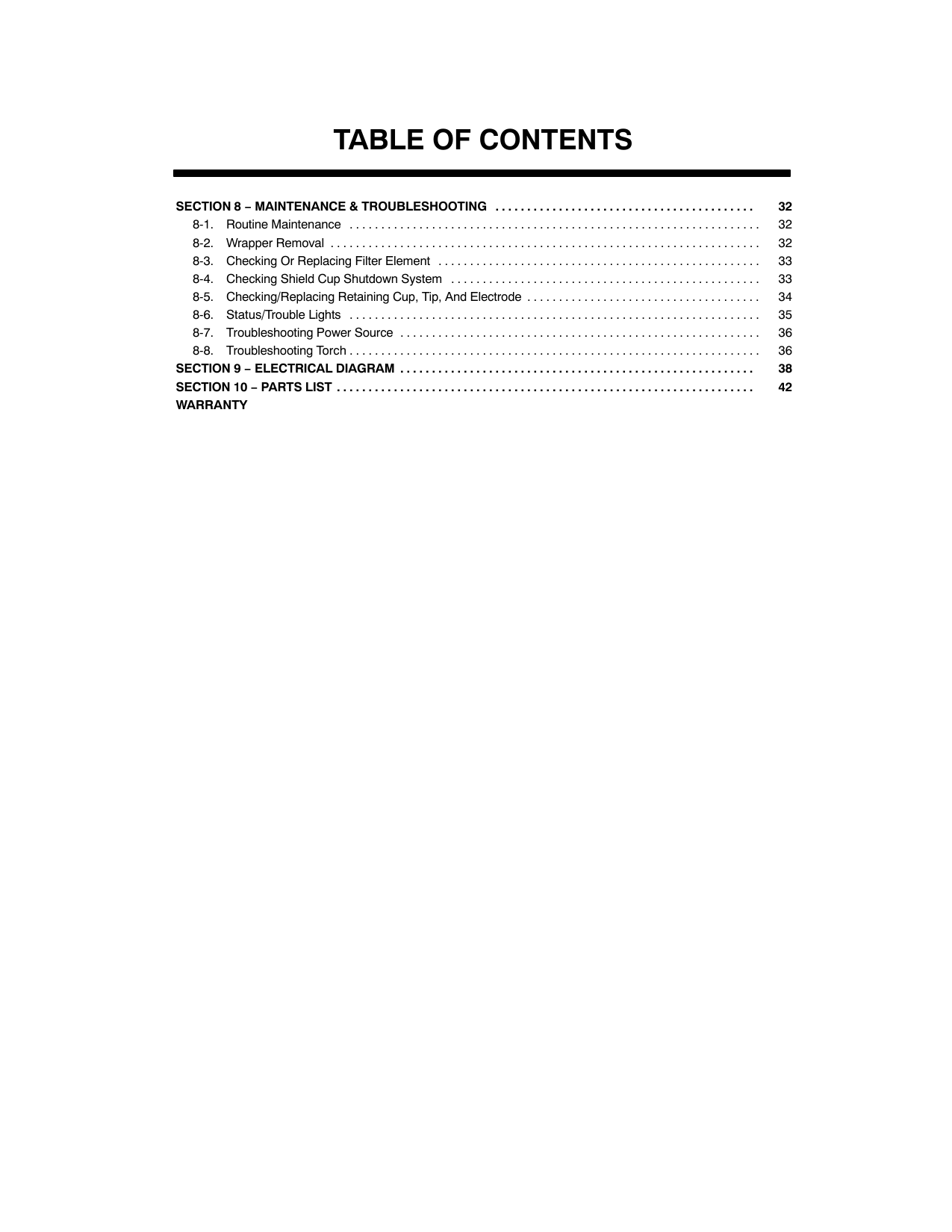 32 . . . . . . . . . . . . . . . . . . . . . . . . . . . . . . . . . . . . . . . . . 8-1. Routine Maintenance 32 . . . . . . . . . . . . . . . . . . . . . . . . . . . . . . . . . . . . . . . . . . . . . . . . . . . . . . . . . . . . . . . . . 8-2. Wrapper Removal 32 . . . . . . . . . . . . . . . . . . . . . . . . . . . . . . . . . . . . . . . . . . . . . . . . . . . . . . . . . . . . . . . . . . . . 8-3. Checking Or Replacing Filter Element 33 . . . . . . . . . . . . . . . . . . . . . . . . . . . . . . . . . . . . . . . . . . . . . . . . . . . 8-4. Checking Shield Cup Shutdown System 33 . . . . . . . . . . . . . . . . . . . . . . . . . . . . . . . . . . . . . . . . . . . . . . . . . 8-5. Checking/Replacing Retaining Cup, Tip, And Electrode 34 . . . . . . . . . . . . . . . . . . . . . . . . . . . . . . . . . . . . . 8-6. Status/Trouble Lights 35 . . . . . . . . . . . . . . . . . . . . . . . . . . . . . . . . . . . . . . . . . . . . . . . . . . . . . . . . . . . . . . . . . 8-7. Troubleshooting Power Source 36 . . . . . . . . . . . . . . . . . . . . . . . . . . . . . . . . . . . . . . . . . . . . . . . . . . . . . . . . . 8-8. Troubleshooting Torch 36 . . . . . . . . . . . . . . . . . . . . . . . . . . . . . . . . . . . . . . . . . . . . . . . . . . . . . . . . . . . . . . . . .Section 9 − Electrical Diagram