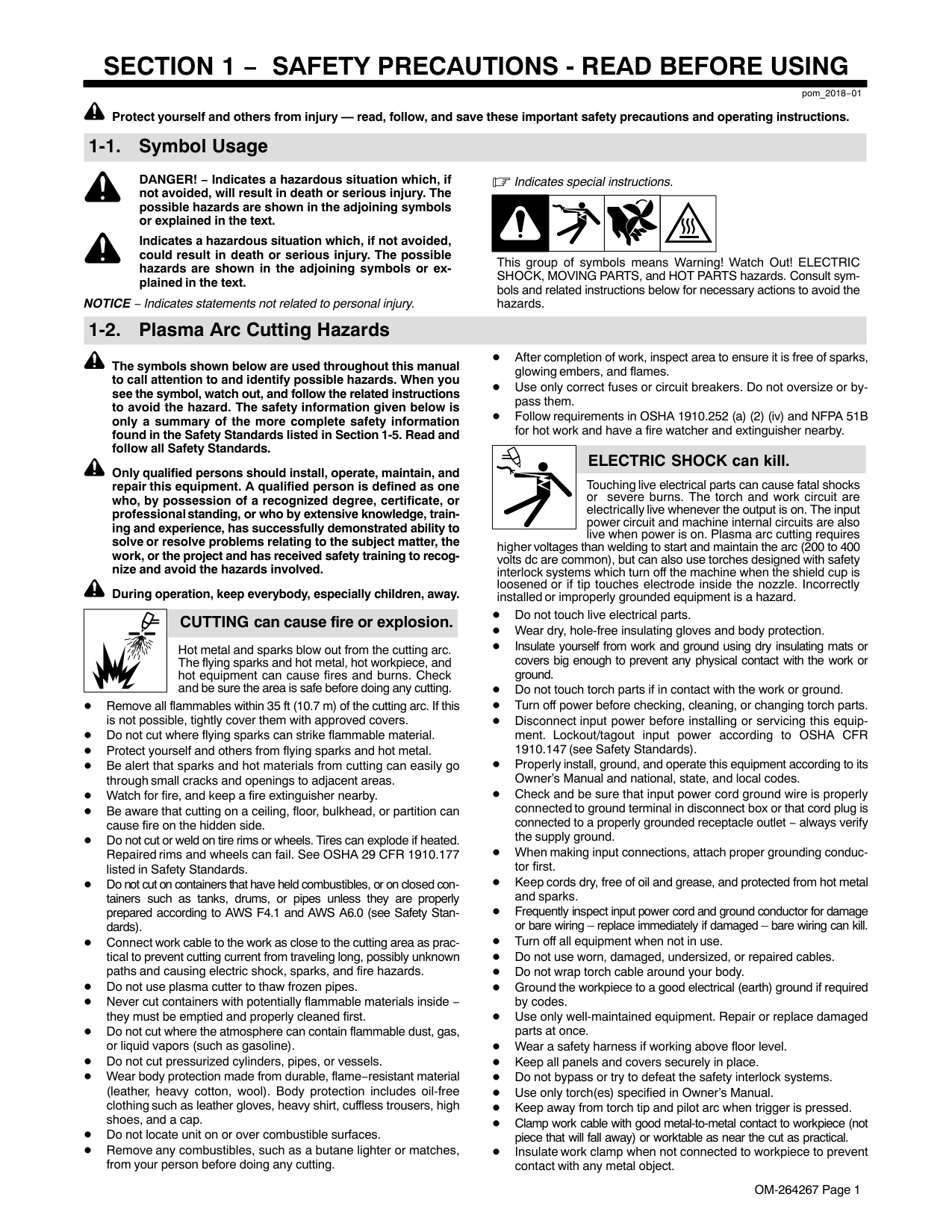 pom_2018−01 Protect yourself and others from injury — read, follow, and save these important safety precautions and operating instructions. 1-1. Symbol Usage DANGER! − Indicates a hazardous situation which, if not avoided, will result in death or serious injury. The possible hazards are shown in the adjoining symbols or explained in the text. Indicates a hazardous situation which, if not avoided, could result in death or serious injury. The possible hazards are shown in the adjoining symbols or ex- plained in the text. NOTICE − Indicates statements not related to personal injury. Indicates special instructions. This group of symbols means Warning! Watch Out! ELECTRIC SHOCK, MOVING PARTS, and HOT PARTS hazards. Consult sym- bols and related instructions below for necessary actions to avoid the hazards. 1-2. Plasma Arc Cutting Hazards The symbols shown below are used throughout this manual to call attention to and identify possible hazards. When you see the symbol, watch out, and follow the related instructions to avoid the hazard. The safety information given below is only a summary of the more complete safety information found in the Safety Standards listed in Section 1-5. Read and follow all Safety Standards. Only qualified persons should install, operate, maintain, and repair this equipment. A qualified person is defined as one who, by possession of a recognized degree, certificate, or professional standing, or who by extensive knowledge, train- ing and experience, has successfully demonstrated ability to solve or resolve problems relating to the subject matter, the work, or the project and has received safety training to recog- nize and avoid the hazards involved. During operation, keep everybody, especially children, away. Hot metal and sparks blow out from the cutting arc. The flying sparks and hot metal, hot workpiece, and hot equipment can cause fires and burns. Check and be sure the area is safe before doing any cutting. CUTTING can cause fire or explosion. Remove all flammables within 35 ft (10.7 m) of the cutting arc. If this is not possible, tightly cover them with approved covers. Do not cut where flying sparks can strike flammable material. Protect yourself and others from flying sparks and hot metal. Be alert that sparks and hot materials from cutting can easily go through small cracks and openings to adjacent areas. Watch for fire, and keep a fire extinguisher nearby. Be aware that cutting on a ceiling, floor, bulkhead, or partition can cause fire on the hidden side. Do not cut or weld on tire rims or wheels. Tires can explode if heated. Repaired rims and wheels can fail. See OSHA 29 CFR 1910.177 listed in Safety Standards. Do not cut on containers that have held combustibles, or on closed con- tainers such as tanks, drums, or pipes unless they are properly prepared according to AWS F4.1 and AWS A6.0 (see Safety Stan- dards). Connect work cable to the work as close to the cutting area as prac- tical to prevent cutting current from traveling long, possibly unknown paths and causing electric shock, sparks, and fire hazards. Do not use plasma cutter to thaw frozen pipes. Never cut containers with potentially flammable materials inside − they must be emptied and properly cleaned first. Do not cut where the atmosphere can contain flammable dust, gas, or liquid vapors (such as gasoline). Do not cut pressurized cylinders, pipes, or vessels. Wear body protection made from durable, flame−resistant material (leather, heavy cotton, wool). Body protection includes oil-free clothing such as leather gloves, heavy shirt, cuffless trousers, high shoes, and a cap. Do not locate unit on or over combustible surfaces. Remove any combustibles, such as a butane lighter or matches, from your person before doing any cutting. After completion of work, inspect area to ensure it is free of sparks, glowing embers, and flames. Use only correct fuses or circuit breakers. Do not oversize or by- pass them. Follow requirements in OSHA 1910.252 (a) (2) (iv) and NFPA 51B for hot work and have a fire watcher and extinguisher nearby. Touching live electrical parts can cause fatal shocks or severe burns. The torch and work circuit are electrically live whenever the output is on. The input power circuit and machine internal circuits are also live when power is on. Plasma arc cutting requires higher voltages than welding to start and maintain the arc (200 to 400 volts dc are common), but can also use torches designed with safety interlock systems which turn off the machine when the shield cup is loosened or if tip touches electrode inside the nozzle. Incorrectly installed or improperly grounded equipment is a hazard. ELECTRIC SHOCK can kill. Do not touch live electrical parts. Wear dry, hole-free insulating gloves and body protection. Insulate yourself from work and ground using dry insulating mats or covers big enough to prevent any physical contact with the work or ground. Do not touch torch parts if in contact with the work or ground. Turn off power before checking, cleaning, or changing torch parts. Disconnect input power before installing or servicing this equip- ment. Lockout/tagout input power according to OSHA CFR 1910.147 (see Safety Standards). Properly install, ground, and operate this equipment according to its Owner’s Manual and national, state, and local codes. Check and be sure that input power cord ground wire is properly connected to ground terminal in disconnect box or that cord plug is connected to a properly grounded receptacle outlet − always verify the supply ground. When making input connections, attach proper grounding conduc- tor first. Keep cords dry, free of oil and grease, and protected from hot metal and sparks. Frequently inspect input power cord and ground conductor for damage or bare wiring – replace immediately if damaged – bare wiring can kill. Turn off all equipment when not in use. Do not use worn, damaged, undersized, or repaired cables. Do not wrap torch 