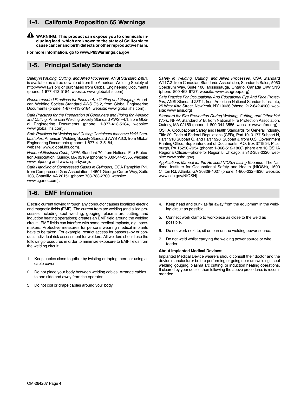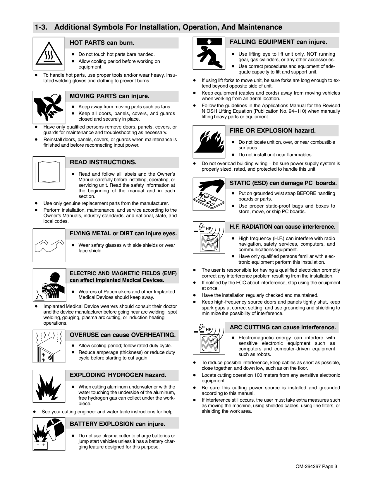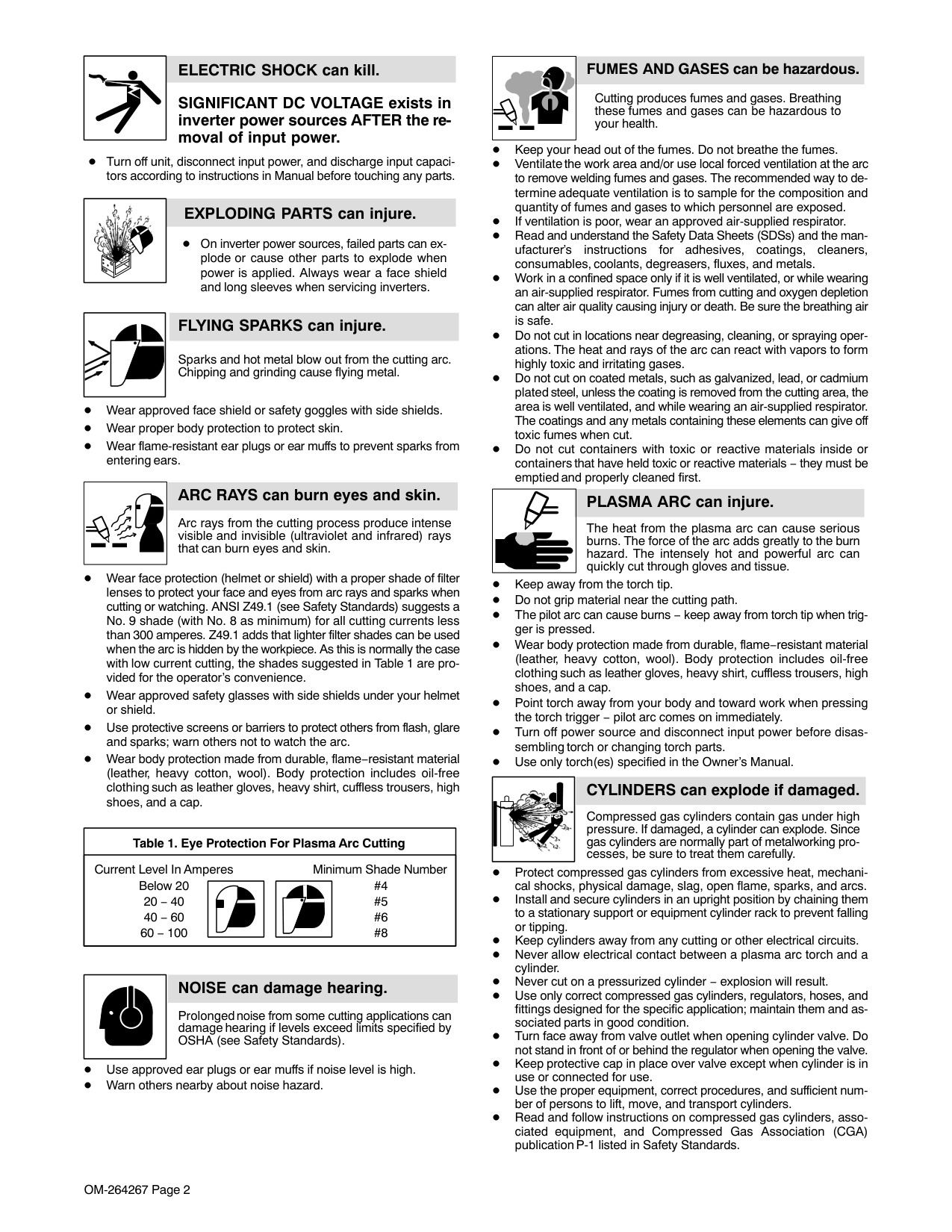 can affect Implanted Medical Devices. Wearers of Pacemakers and other Implanted Medical Devices should keep away. Implanted Medical Device wearers should consult their doctor and the device manufacturer before going near arc welding, spot welding, gouging, plasma arc cutting, or induction heating operations. OVERUSE can cause OVERHEATING. Allow cooling period; follow rated duty cycle. Reduce amperage (thickness) or reduce duty cycle before starting to cut again. EXPLODING HYDROGEN hazard. When cutting aluminum underwater or with the water touching the underside of the aluminum, free hydrogen gas can collect under the work- piece. See your cutting engineer and water table instructions for help. BATTERY EXPLOSION can injure. Do not use plasma cutter to charge batteries or jump start vehicles unless it has a battery char- ging feature designed for this purpose. FALLING EQUIPMENT can injure. Use lifting eye to lift unit only, NOT running gear, gas cylinders, or any other accessories. Use correct procedures and equipment of ade- quate capacity to lift and support unit. If using lift forks to move unit, be sure forks are long enough to ex- tend beyond opposite side of unit. Keep equipment (cables and cords) away from moving vehicles when working from an aerial location. Follow the guidelines in the Applications Manual for the Revised NIOSH Lifting Equation (Publication No. 94−110) when manually lifting heavy parts or equipment. FIRE OR EXPLOSION hazard. Do not locate unit on, over, or near combustible surfaces. Do not install unit near flammables. Do not overload building wiring − be sure power supply system is properly sized, rated, and protected to handle this unit. STATIC (ESD) can damage PC boards. Put on grounded wrist strap BEFORE handling boards or parts. Use proper static-proof bags and boxes to store, move, or ship PC boards. H.F. RADIATION can cause interference. High frequency (H.F.) can interfere with radio navigation, safety services, computers, and communications equipment. Have only qualified persons familiar with elec- tronic equipment perform this installation. The user is responsible for having a qualified electrician promptly correct any interference problem resulting from the installation. If notified by the FCC about interference, stop using the equipment at once. Have the installation regularly checked and maintained. Keep high-frequency source doors and panels tightly shut, keep spark gaps at correct setting, and use grounding and shielding to minimize the possibility of interference. ARC CUTTING can cause interference. Electromagnetic energy can interfere with sensitive electronic equipment such as computers and computer-driven equipment such as robots. To reduce possible interference, keep cables as short as possible, close together, and down low, such as on the floor. Locate cutting operation 100 meters from any sensitive electronic equipment. Be sure this cutting power source is installed and grounded according to this manual. If interference still occurs, the user must take extra measures such as moving the machine, using shielded cables, using line filters, or shielding the work area.OM-264267 Page 4 1-4. California Proposition 65 Warnings WARNING: This product can expose you to chemicals in- cluding lead, which are known to the state of California to cause cancer and birth defects or other reproductive harm. For more information, go to www.P65Warnings.ca.gov. 1-5. Principal Safety Standards Safety in Welding, Cutting, and Allied Processes, ANSI Standard Z49.1, is available as a free download from the American Welding Society at http://www.aws.org or purchased from Global Engineering Documents (phone: 1-877-413-5184, website: www.global.ihs.com). Recommended Practices for Plasma Arc Cutting and Gouging, Ameri- can Welding Society Standard AWS C5.2, from Global Engineering Documents (phone: 1-877-413-5184, website: www.global.ihs.com). Safe Practices for the Preparation of Containers and Piping for Welding and Cutting, American Welding Society Standard AWS F4.1, from Glob- al Engineering Documents (phone: 1-877-413-5184, website: www.global.ihs.com). Safe Practices for Welding and Cutting Containers that have Held Com- bustibles, American Welding Society Standard AWS A6.0, from Global Engineering Documents (phone: 1-877-413-5184, website: www.global.ihs.com). National Electrical Code, NFPA Standard 70, from National Fire Protec- tion Association, Quincy, MA 02169 (phone: 1-800-344-3555, website: www.nfpa.org and www. sparky.org). Safe Handling of Compressed Gases in Cylinders, CGA Pamphlet P-1, from Compressed Gas Association, 14501 George Carter Way, Suite 103, Chantilly, VA 20151 (phone: 703-788-2700, website: www.cganet.com). Safety in Welding, Cutting, and Allied Processes, CSA Standard W117.2, from Canadian Standards Association, Standards Sales, 5060 Spectrum Way, Suite 100, Mississauga, Ontario, Canada L4W 5NS (phone: 800-463-6727, website: www.csagroup.org). Safe Practice For Occupational And Educational Eye And Face Protec- tion, ANSI Standard Z87.1, from American National Standards Institute, 25 West 43rd Street, New York, NY 10036 (phone: 212-642-4900, web- site: www.ansi.org). Standard for Fire Prevention During Welding, Cutting, and Other Hot Work, NFPA Standard 51B, from National Fire Protection Association, Quincy, MA 02169 (phone: 1-800-344-3555, website: www.nfpa.org). OSHA, Occupational Safety and Health Standards for General Industry, Title 29, Code of Federal Regulations (CFR), Part 1910.177 Subpart N, Part 1910 Subpart Q, and Part 1926, Subpart J, from U.S. Government Printing Office, Superintendent of Documents, P.O. Box 371954, Pitts- burgh, PA 15250-7954 (phone: 1-866-512-1800) (there are 10 OSHA Regional Offices—phone for Region 5, Chicago, is 312-353-2220, web- site: www.osha.gov). Applications Manual for the Revised NIOSH Lifting Equation, The Na- tional Institute for Occupational Safety and Health (NIOSH), 1600 Clifton Rd, Atlanta, 