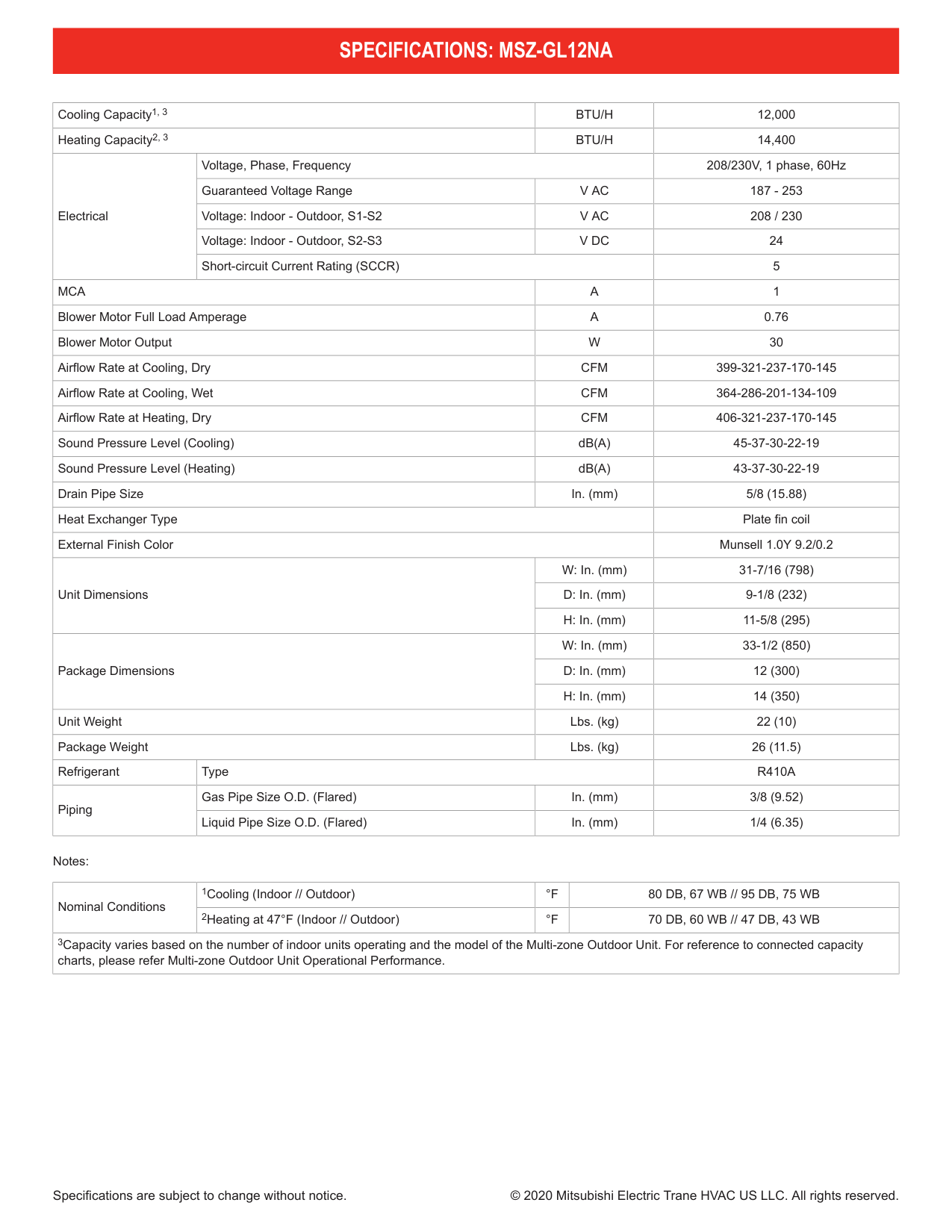 3Capacity varies based on the number of indoor units operating and the model of the Multi-zone Outdoor Unit. For reference to connected capacity charts, please refer Multi-zone Outdoor Unit Operational Performance.Specifications: Msz-Gl12Na