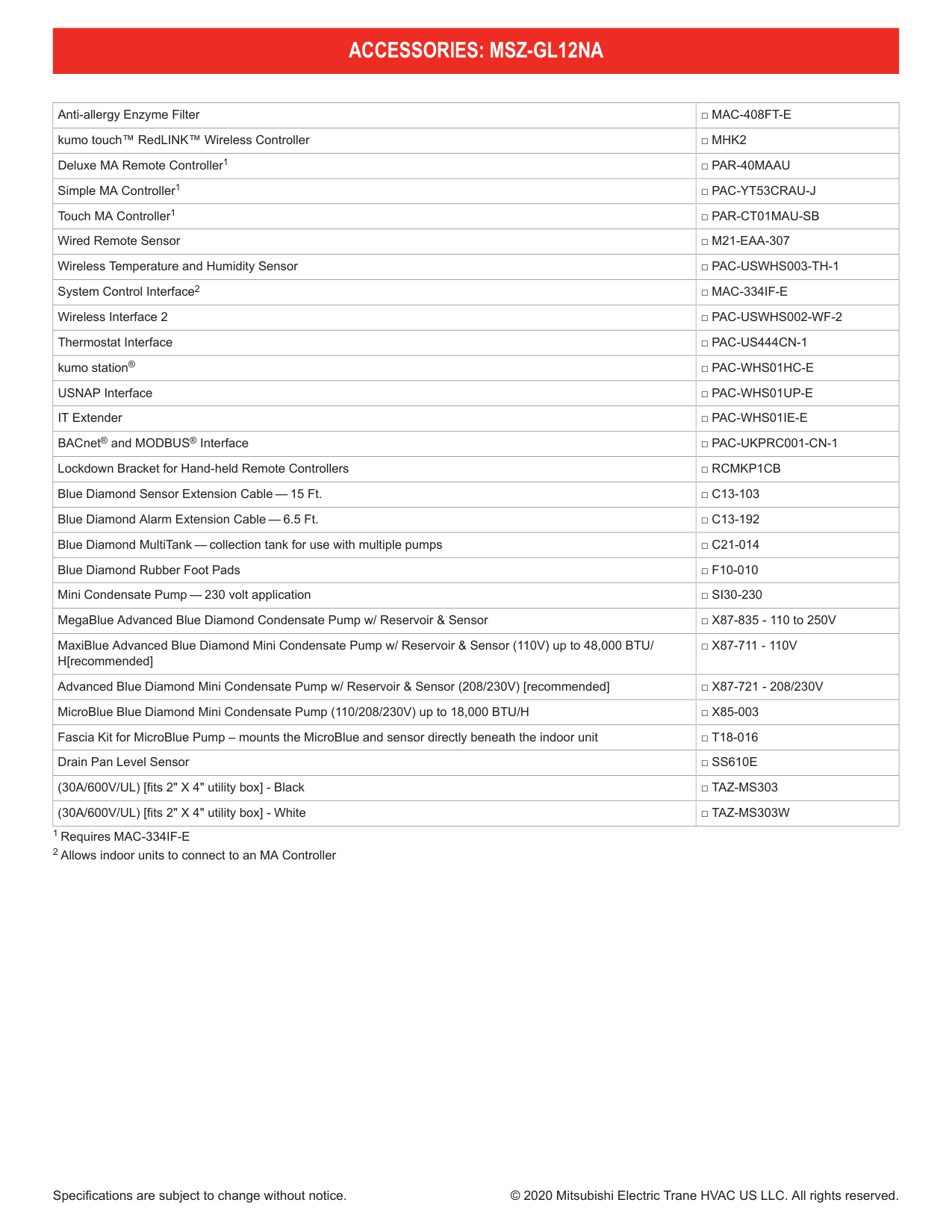 1 Requires MAC-334IF-E 2 Allows indoor units to connect to an MA ControllerAccessories: Msz-Gl12Na