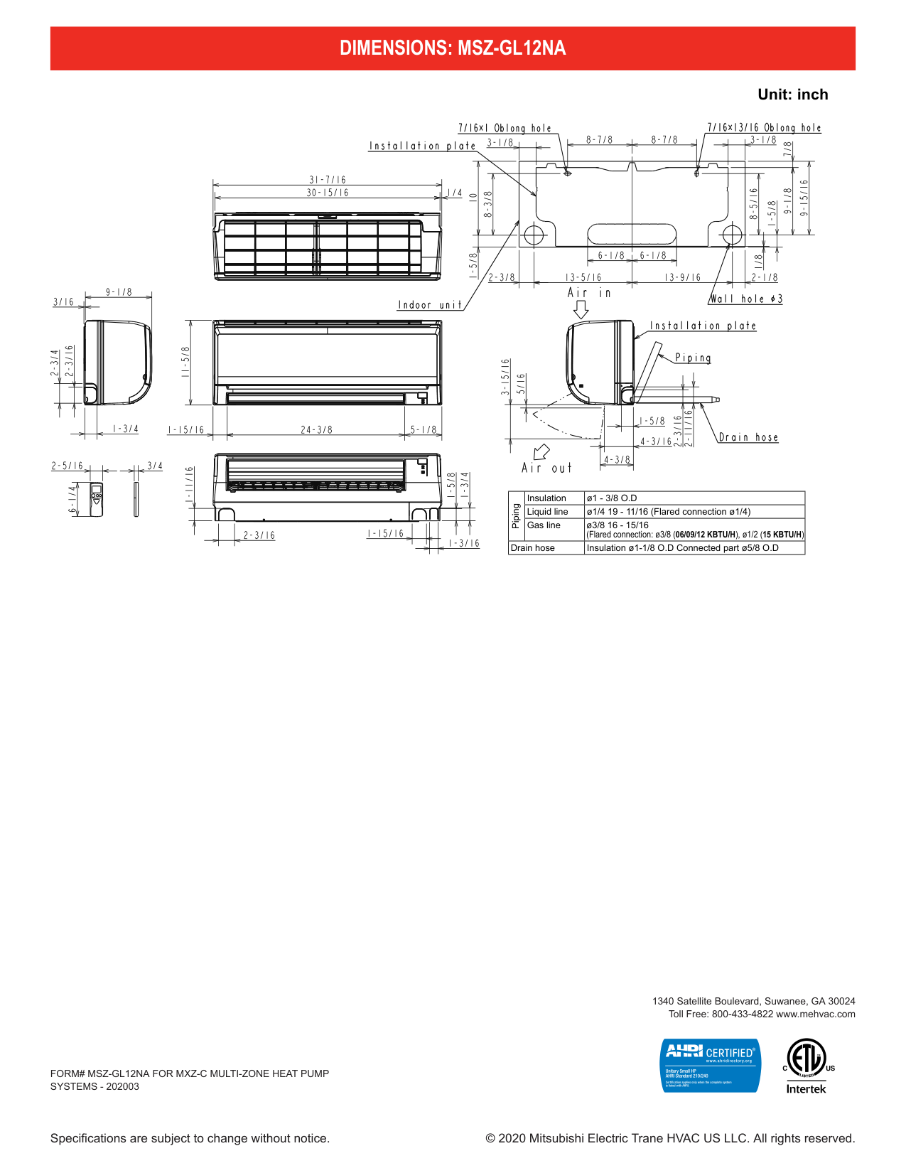 Specifications are subject to change without notice. © 2020 Mitsubishi Electric Trane HVAC US LLC. All rights reserved.Unit: inch Piping Insulation ø1 - 3/8 O.D Liquid line ø1/4 19 - 11/16 (Flared connection ø1/4) Gas line ø3/8 16 - 15/16 (Flared connection: ø3/8 (06/09/12 KBTU/H), ø1/2 (15 KBTU/H) Drain hose Insulation ø1-1/8 O.D Connected part ø5/8 O.D