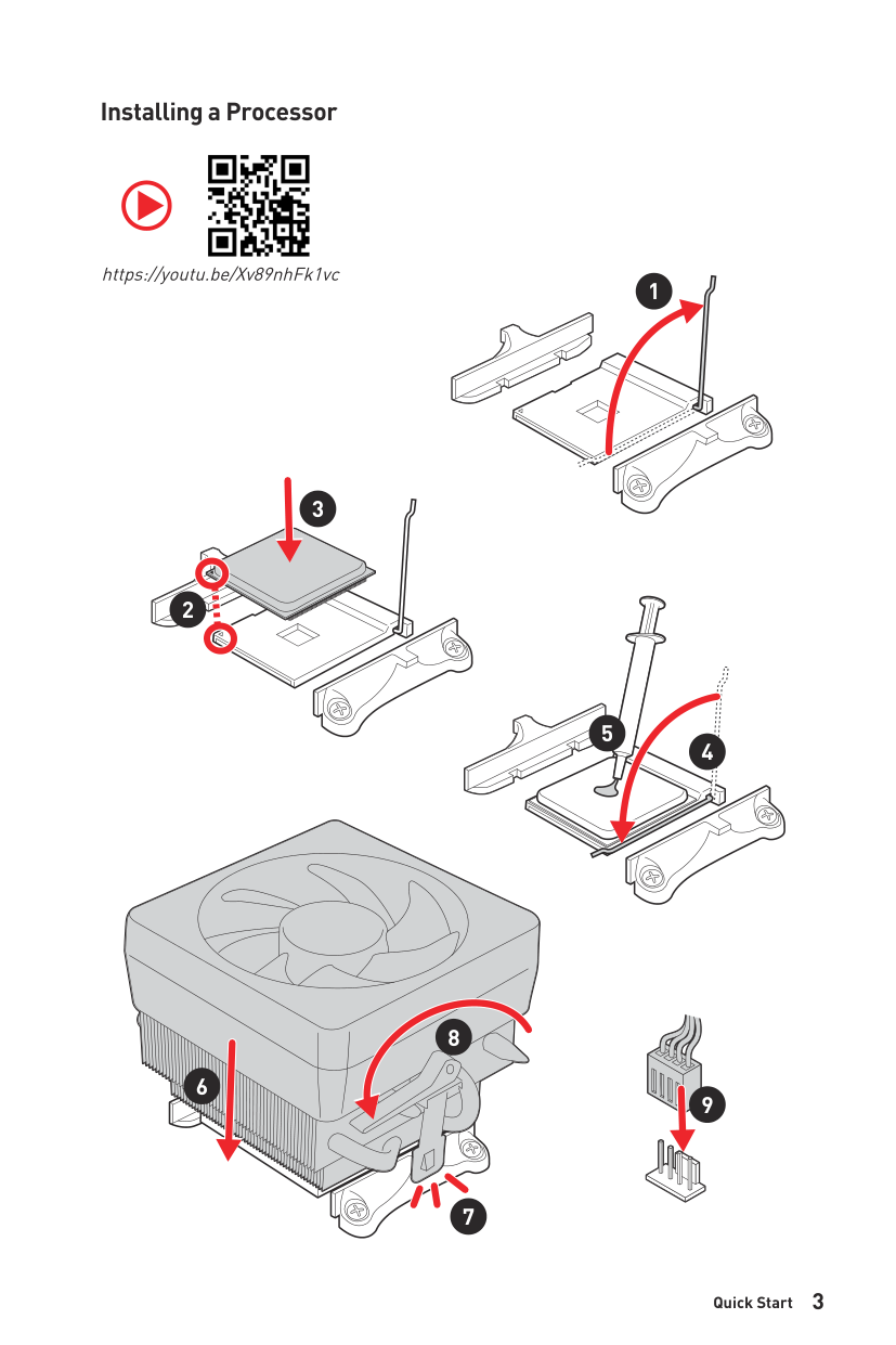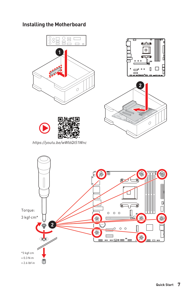 4 Quick Start Thank you for purchasing a new motherboard from MSI®. This Quick Start section provides demonstration diagrams about how to install your computer. Some of the installations also provide video demonstrations. Please link to the URL to watch it with the web browser on your phone or tablet. You may have even link to the URL by scanning the QR code. Preparing Tools and Components Graphics Card SATA Hard Disk Drive Phillips Screwdriver Chassis Power Supply Unit A Package of Screws Thermal Paste CPU Fan