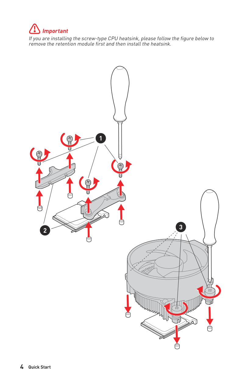 ⚠Important If you are installing the screw-type CPU heatsink, please follow the figure below to remove the retention module first and then install the heatsink. 1 2 3