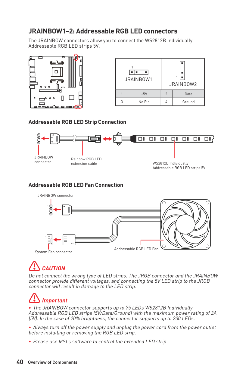 Do not connect the wrong type of LED strips. The JRGB connector and the JRAINBOW connector provide different voltages, and connecting the 5V LED strip to the JRGB connector will result in damage to the LED strip.⚠Important ∙The JRAINBOW connector supports up to 75 LEDs WS2812B Individually Addressable RGB LED strips (5V/Data/Ground) with the maximum power rating of 3A (5V). In the case of 20% brightness, the connector supports up to 200 LEDs. ∙Always turn off the power supply and unplug the power cord from the power outlet before installing or removing the RGB LED strip. ∙Please use MSI’s software to control the extended LED strip. JRAINBOW1~2: Addressable RGB LED connectors The JRAINBOW connectors allow you to connect the WS2812B Individually Addressable RGB LED strips 5V.