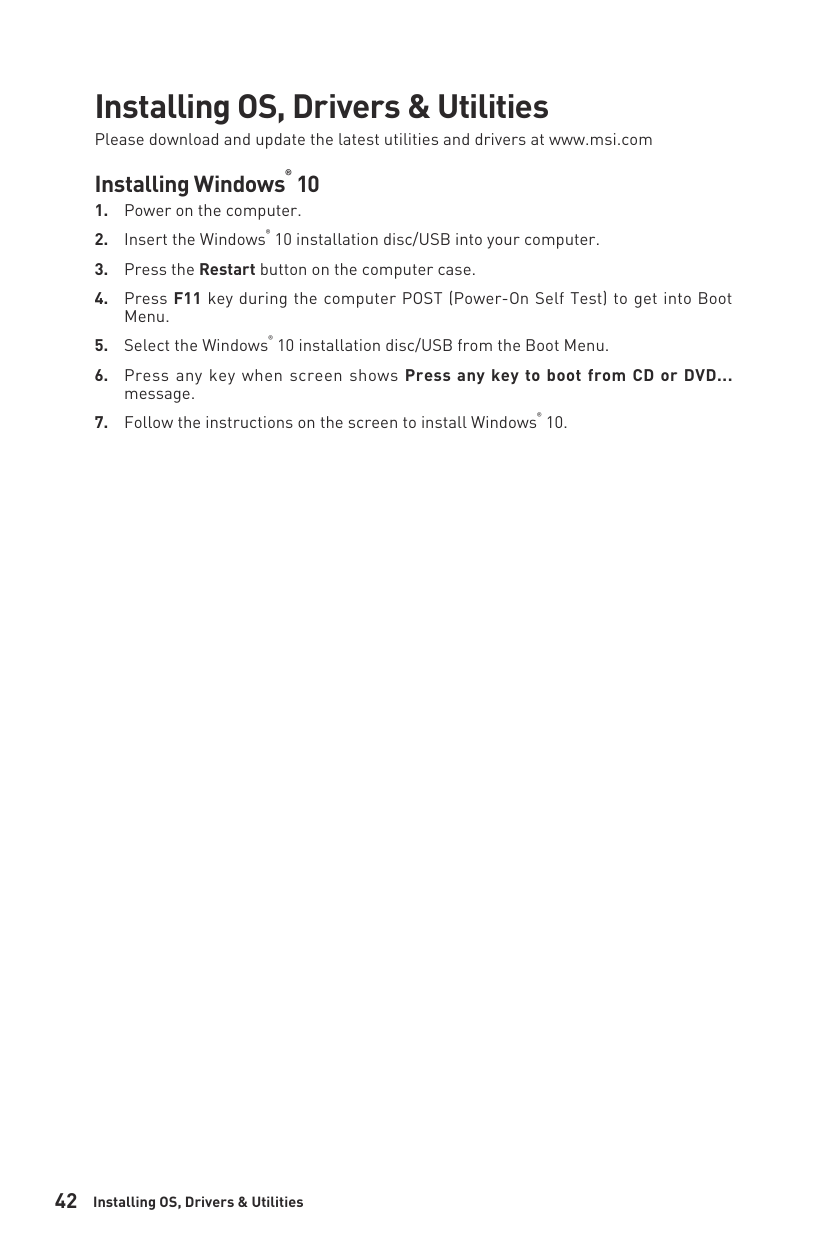 (Default) CPU - indicates CPU is not detected or fail. DRAM - indicates DRAM is not detected or fail. VGA - indicates GPU/ PCIE/ M.2 device is not detected or fail. BOOT - indicates the booting device is not detected or fail.43 Installing OS, Drivers & MSI Center Please download and update the latest utilities and drivers at www.msi.com Installing Windows 11