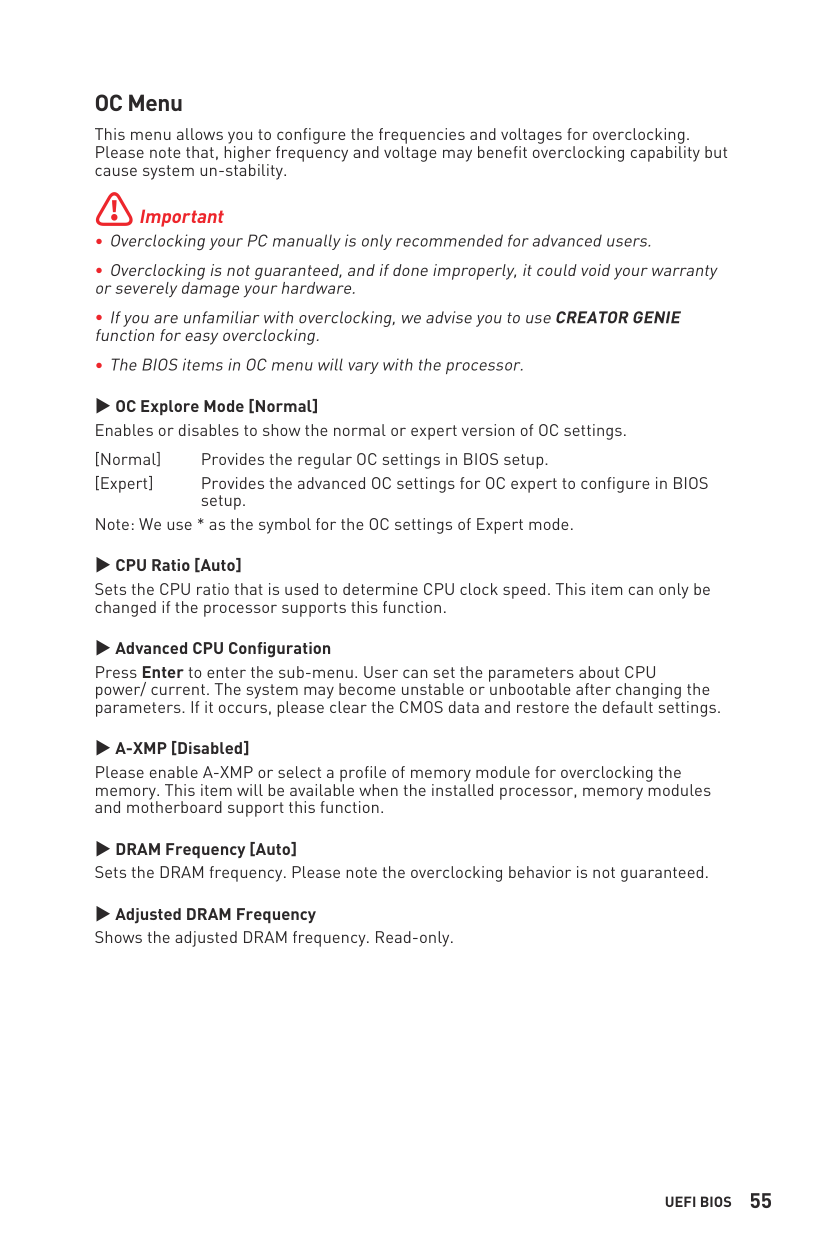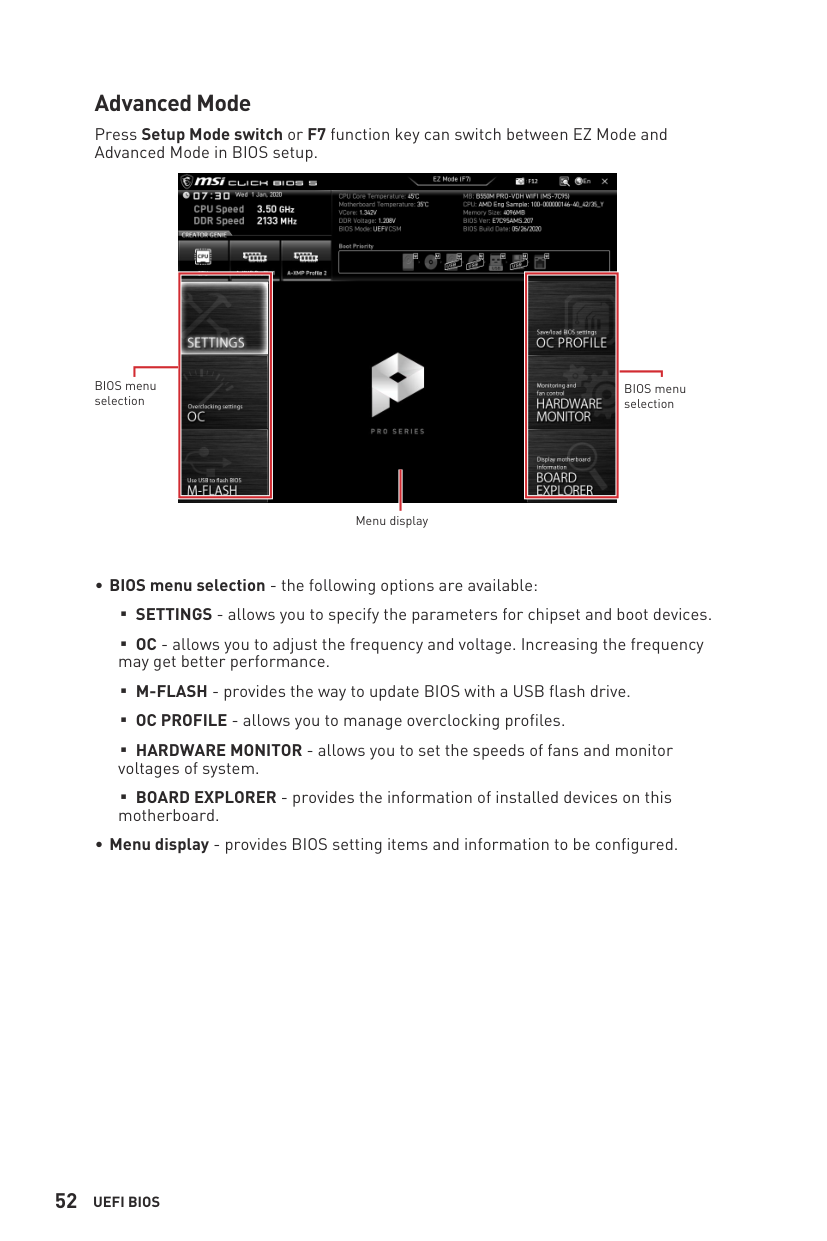 MSI UEFI BIOS is compatible with UEFI (Unified Extensible Firmware Interface) architecture. UEFI has many new functions and advantages that traditional BIOS cannot achieve, and it will completely replace BIOS in the future. The MSI UEFI BIOS uses UEFI as the default boot mode to take full advantage of the new chipset capabilities.⚠Important The term BIOS in this user guide refers to UEFI BIOS unless otherwise noted. UEFI advantages ∙Fast booting - UEFI can directly boot the operating system and save the BIOS self- test process. It can also eliminate the time to switch to CSM mode during POST. ∙Supports for hard drive partitions larger than 2 TB. ∙Supports more than 4 primary partitions with a GUID Partition Table (GPT). ∙Supports unlimited number of partitions. ∙Supports full capabilities of new devices - new devices may not provide backward compatibility. ∙Supports secure startup - UEFI can check the validity of the operating system to ensure that no malware tampers with the startup process. Incompatible UEFI cases ∙32-bit Windows operating system - this motherboard supports only Windows 11 64-bit operating system. ∙Older graphics card - the system will detect your graphics card. If you use older graphics cards, it may display a warning message There is no GOP (Graphics Output protocol) support detected in this graphics card.