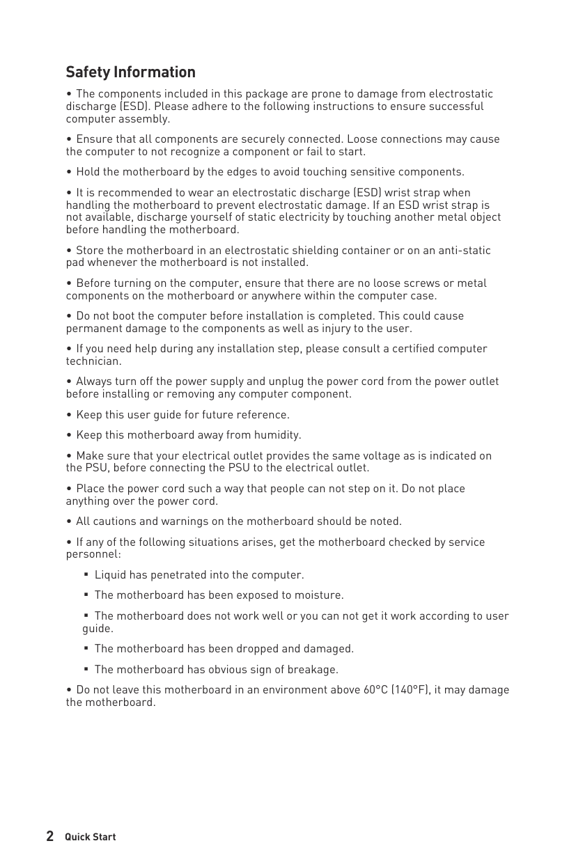 You should wear an electrostatic discharge (ESD) wrist strap when handling the motherboard; if unavailable, discharge static electricity by touching another metal object first. Always turn off the power supply and unplug the power cord before installing or removing any component, and store the motherboard in an electrostatic shielding container when not installed. Do not operate the motherboard in environments above 60°C (140°F). (Page 2)