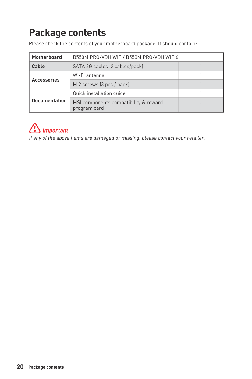 1 Quick Start Quick Start Thank you for purchasing the MSI® B550M PRO-VDH WIFI/ B550M PRO-VDH WIFI6 motherboard. This Quick Start section provides demonstration diagrams about how to install your computer. Some of the installations also provide video demonstrations. Please link to the URL to watch it with the web browser on your phone or tablet. You may have even link to the URL by scanning the QR code. Preparing Tools and Components DDR4 Memory Graphics Card SATA Hard Disk Drive SATA DVD Drive Phillips Screwdriver Chassis Power Supply Unit A Package of Screws Thermal Paste CPU Fan