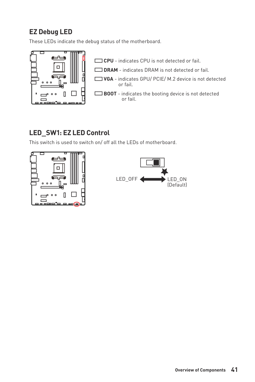 The EZ Debug LEDs indicate specific failure points during boot. CPU LED means the CPU is not detected or has failed, DRAM LED means memory is not detected or has failed, VGA LED means a GPU/PCIe/M.2 device is not detected or has failed, and BOOT LED means the boot device is not detected or has failed. (Page 41)