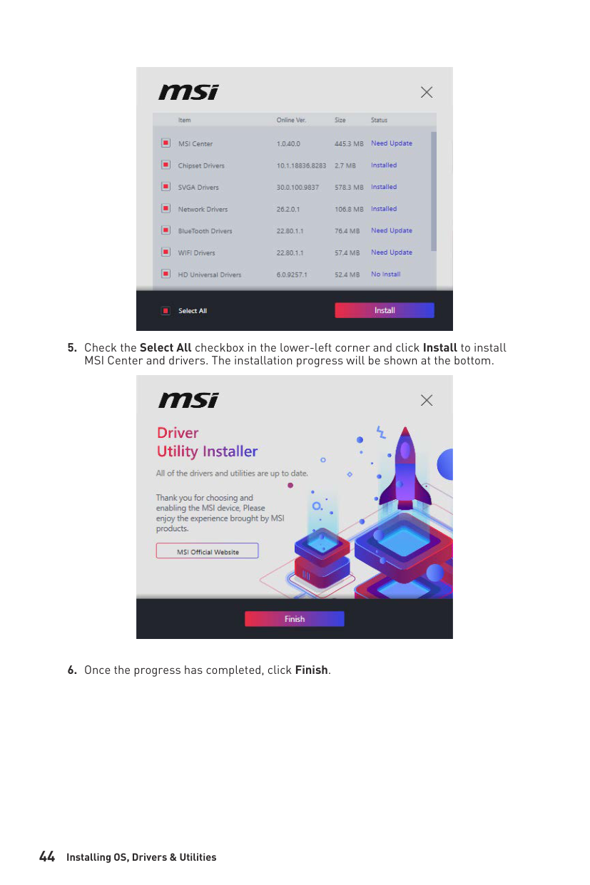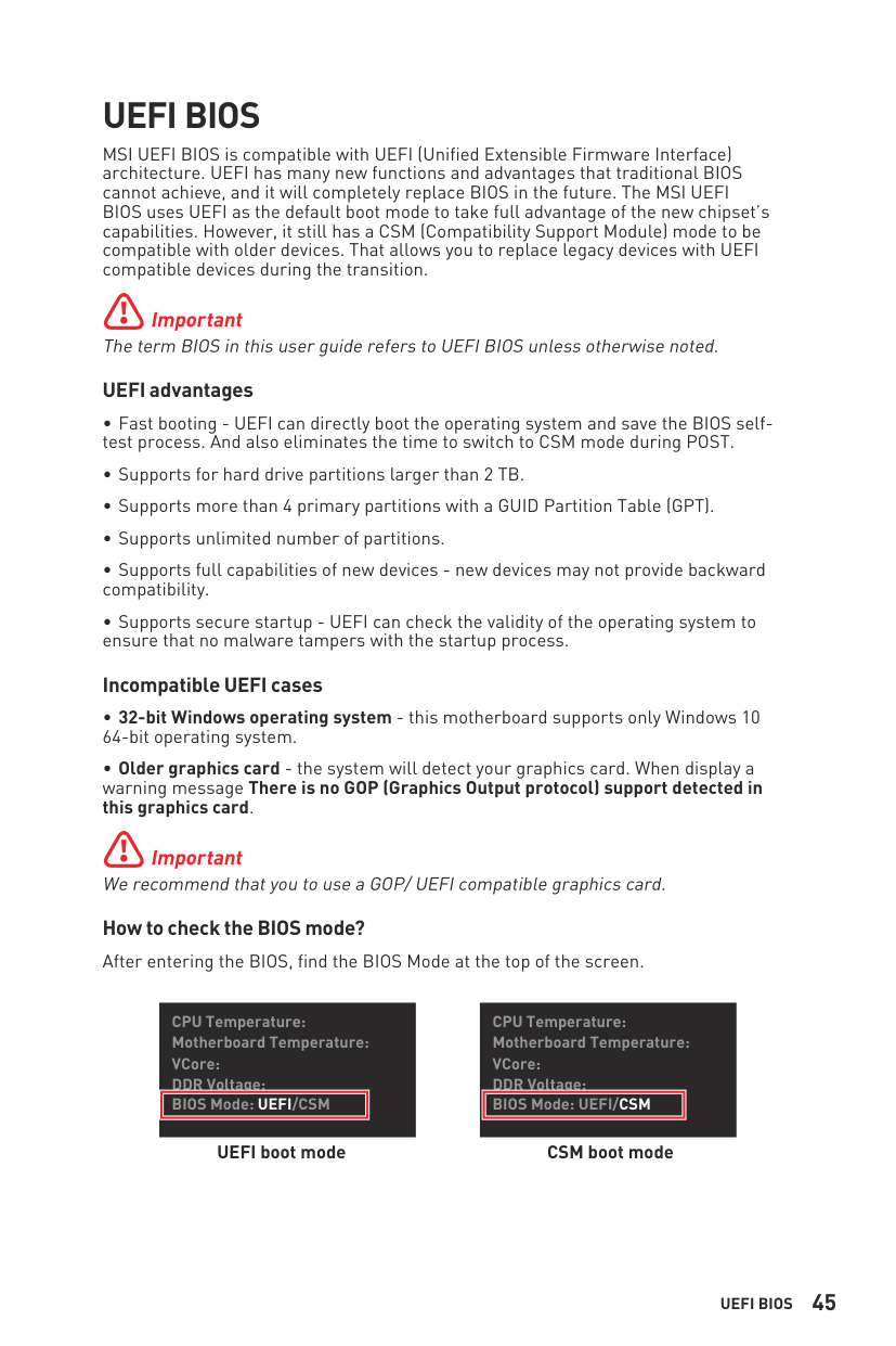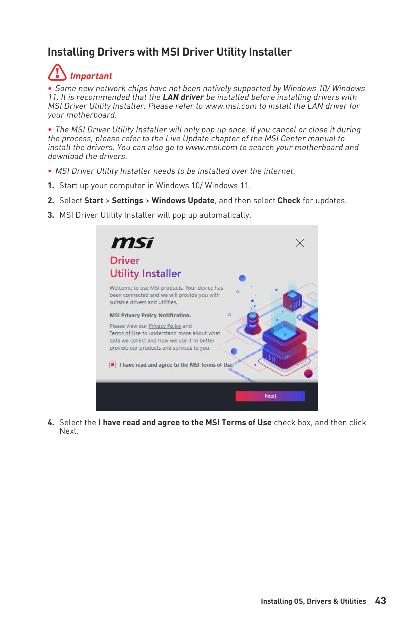 14 Contents JRAINBOW1~2: Addressable RGB LED connectors ............................................. 40 EZ Debug LED ....................................................................................................... 41 LED_SW1: EZ LED Control ................................................................................... 41 Installing OS, Drivers & Utilities ......................................................................... 42 Installing Windows® 10 ......................................................................................... 42 Installing Drivers with MSI Driver Utility Installer ............................................... 43 UEFI BIOS ............................................................................................................. 45 BIOS Setup ............................................................................................................ 46 Entering BIOS Setup ............................................................................................. 46 Resetting BIOS ...................................................................................................... 47 Updating BIOS ....................................................................................................... 47 EZ Mode ................................................................................................................ 49 Advanced Mode .................................................................................................... 52 SETTINGS Menu ................................................................................................... 53 OC Menu................................................................................................................ 55 M-FLASH Menu .................................................................................................... 58 OC PROFILE Menu ................................................................................................ 59 HARDWARE MONITOR Menu ................................................................................ 60 AMD RAID Configuration ..................................................................................... 62 Enabling RAIDXpert2 Configuration Utility .......................................................... 62 Initializing Disks ................................................................................................... 63 Creating Arrays ..................................................................................................... 64 Deleting Arrays ..................................................................................................... 65 Installing RAID Driver ........................................................................................... 66 Troubleshooting .................................................................................................. 67 Regulatory Notices ................................................................................................. i