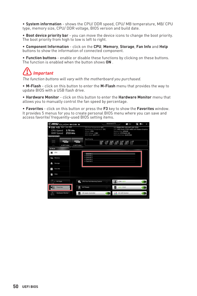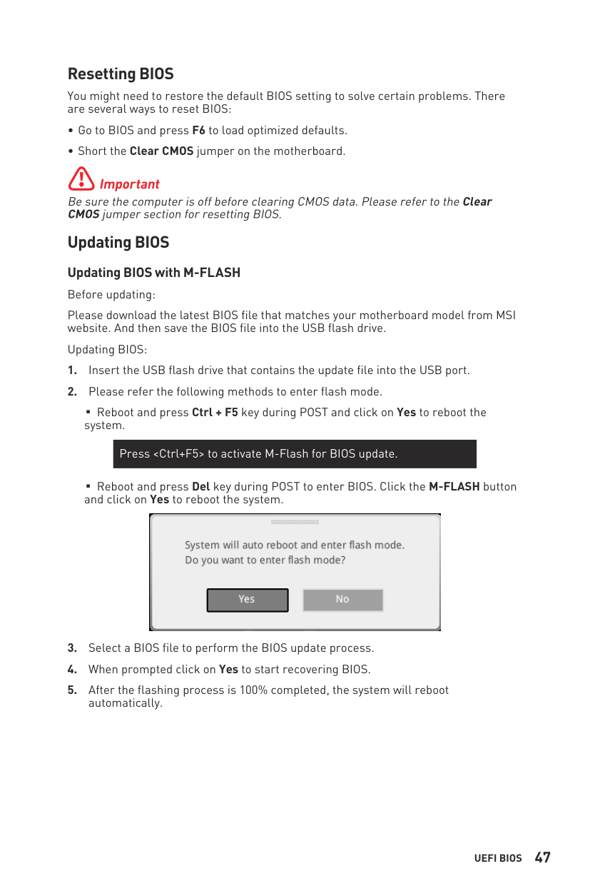 M-FLASH Menu M-FLASH provides the way to update BIOS with a USB flash drive. Please download the latest BIOS file that matches your motherboard model from MSI website, save the BIOS file into your USB flash drive. And then follow the steps below to update BIOS.59