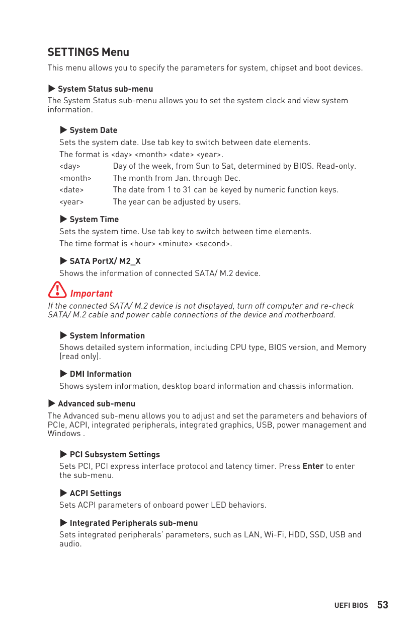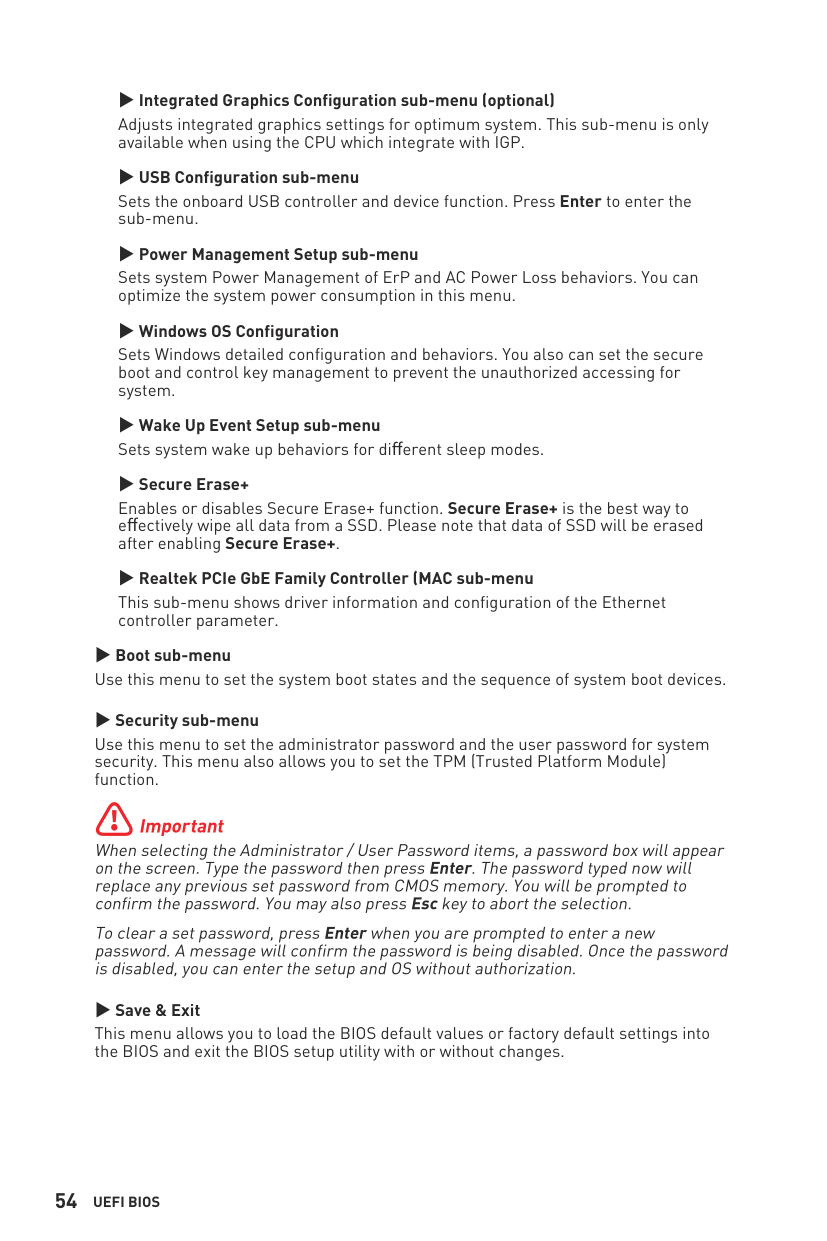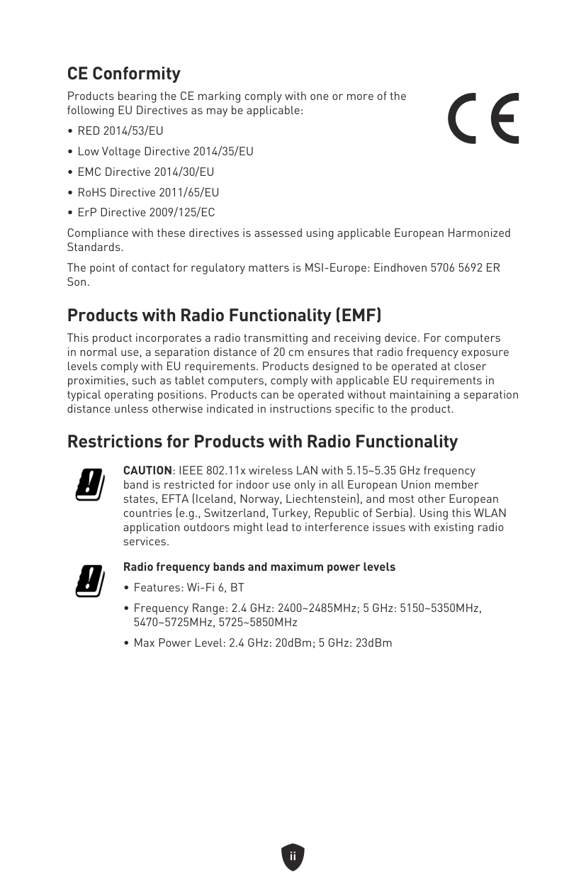 ∙Low Voltage Directive 2014/35/EU ∙EMC Directive 2014/30/EU ∙RoHS Directive 2011/65/EU ∙ErP Directive 2009/125/EC Compliance with these directives is assessed using applicable European Harmonized Standards. The point of contact for regulatory matters is MSI-Europe: Eindhoven 5706 5692 ER Son. Products with Radio Functionality (EMF) This product incorporates a radio transmitting and receiving device. For computers in normal use, a separation distance of 20 cm ensures that radio frequency exposure levels comply with EU requirements. Products designed to be operated at closer proximities, such as tablet computers, comply with applicable EU requirements in typical operating positions. Products can be operated without maintaining a separation distance unless otherwise indicated in instructions specific to the product. Restrictions for Products with Radio Functionality CAUTION: IEEE 802.11x wireless LAN with 5.15~5.35 GHz frequency band is restricted for indoor use only in all European Union member states, EFTA (Iceland, Norway, Liechtenstein), and most other European countries (e.g., Switzerland, Turkey, Republic of Serbia). Using this WLAN application outdoors might lead to interference issues with existing radio services. Radio frequency bands and maximum power levels ∙Features: Wi-Fi 6, BT ∙Frequency Range: 2.4 GHz: 2400~2485MHz; 5 GHz: 5150~5350MHz, 5470~5725MHz, 5725~5850MHz ∙Max Power Level: 2.4 GHz: 20dBm; 5 GHz: 23dBmiii Wireless Radio Use This device is restricted to indoor use when operating in the 2.4GHz, 5GHz frequency band. Cet appareil doit être utilisé à l’intérieur. 당해 무선설비는 운용중 전파혼신 가능성이 있음. この製品は、周波数帯域 2.4GHz, 5GHz で動作しているときは、屋内においてのみ使用可 能です。