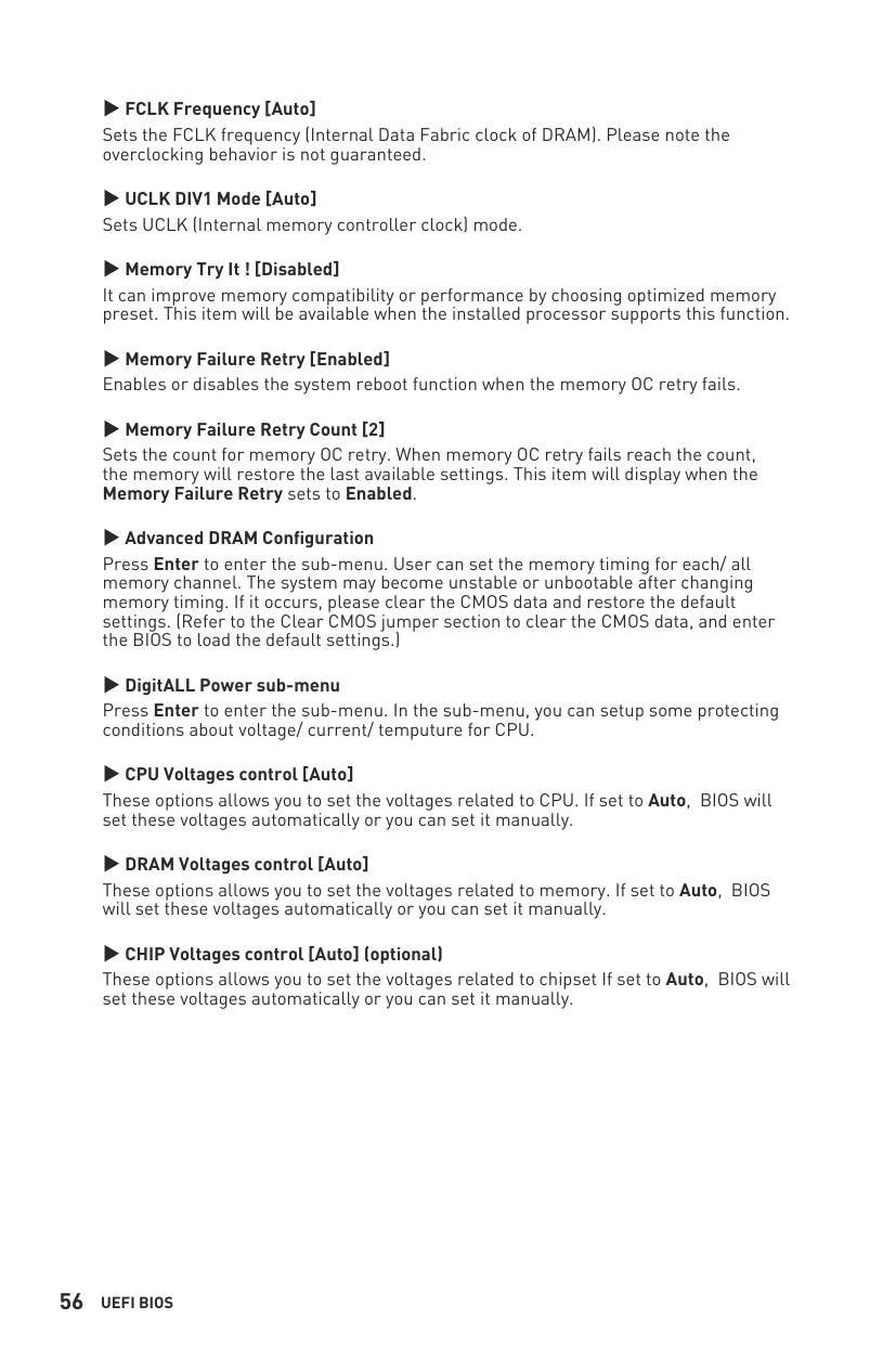 ▶Memory Failure Retry Count [2] Sets the count for memory OC retry. When memory OC retry fails reach the count, the memory will restore the last available settings. This item will display when the Memory Failure Retry sets to Enabled.
