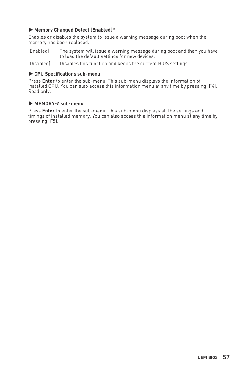 ▶MEMORY-Z sub-menu Press Enter to enter the sub-menu. This sub-menu displays all the settings and timings of installed memory. You can also access this information menu at any time by pressing [F5].