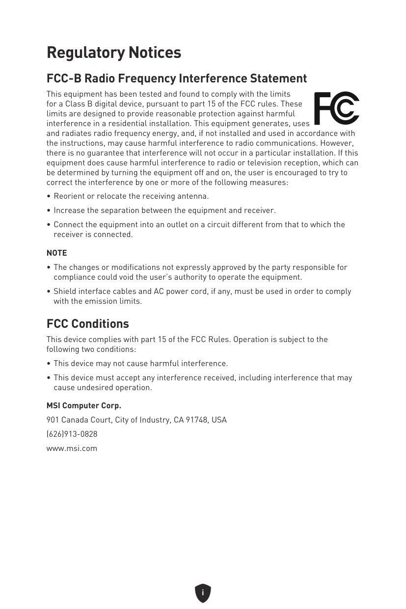 ∙The changes or modifications not expressly approved by the party responsible for compliance could void the user’s authority to operate the equipment. ∙Shield interface cables and AC power cord, if any, must be used in order to comply with the emission limits. FCC Conditions This device complies with part 15 of the FCC Rules. Operation is subject to the following two conditions: ∙This device may not cause harmful interference. ∙This device must accept any interference received, including interference that may cause undesired operation. MSI Computer Corp. 901 Canada Court, City of Industry, CA 91748, USA (626)913-0828 www.msi.comii CE Conformity Products bearing the CE marking comply with one or more of the following EU Directives as may be applicable: