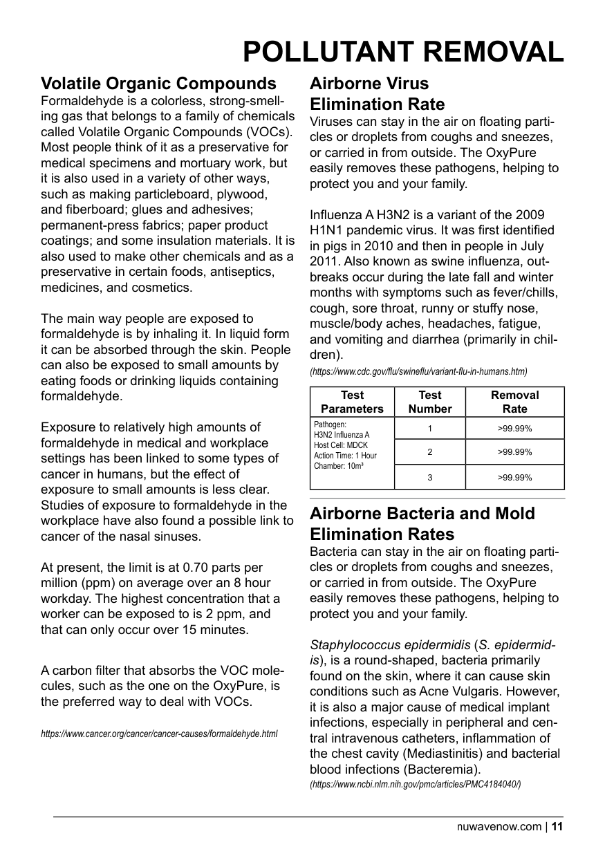 Airborne Virus Elimination Rate Viruses can stay in the air on floating parti- cles or droplets from coughs and sneezes, or carried in from outside. The OxyPure easily removes these pathogens, helping to protect you and your family. Influenza A H3N2 is a variant of the 2009 H1N1 pandemic virus. It was first identified in pigs in 2010 and then in people in July12 | nuwavenow.com