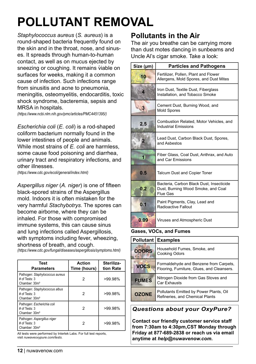 All tests were performed by Intertek Labs. For full test reports, visit nuwaveoxypure.com/tests. Gases, VOCs, and Fumes Size (µm) Particles and Pathogens 10 Fertilizer, Pollen, Plant and Flower Allergens, Mold Spores, and Dust Mites 4 Iron Dust, Textile Dust, Fiberglass Installation, and Tobacco Smoke 3 Cement Dust, Burning Wood, and Mold Spores 2.5 Combustion Related, Motor Vehicles, and Industrial Emissions 2 Lead Dust, Carbon Black Dust, Spores, and Asbestos 1 Fiber Glass, Coal Dust, Anthrax, and Auto and Car Emissions 0.5 Talcum Dust and Copier Toner 0.2 Bacteria, Carbon Black Dust, Insecticide Dust, Burning Wood Smoke, and Coal Flue Gas 0.1 Paint Pigments, Clay, Lead and Radioactive Fallout 0.09 Viruses and Atmospheric Dust Pollutant ExamplesOdors