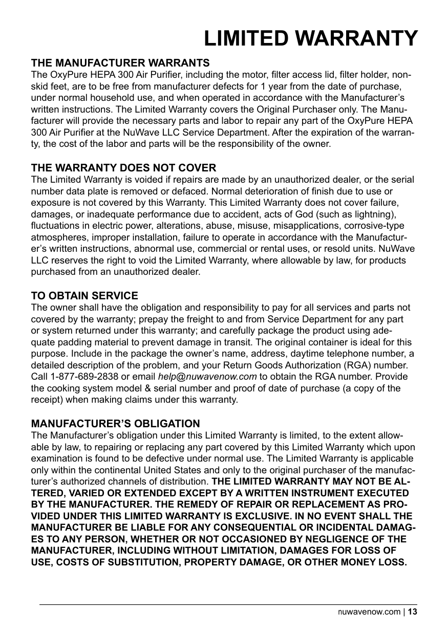 The OxyPure HEPA 300 Air Purifier, including the motor, filter access lid, filter holder, non- skid feet, are to be free from manufacturer defects for 1 year from the date of purchase, under normal household use, and when operated in accordance with the Manufacturer’s written instructions. The Limited Warranty covers the Original Purchaser only. The Manu- facturer will provide the necessary parts and labor to repair any part of the OxyPure HEPA 300 Air Purifier at the NuWave LLC Service Department. After the expiration of the warran- ty, the cost of the labor and parts will be the responsibility of the owner.The Warranty Does Not Cover