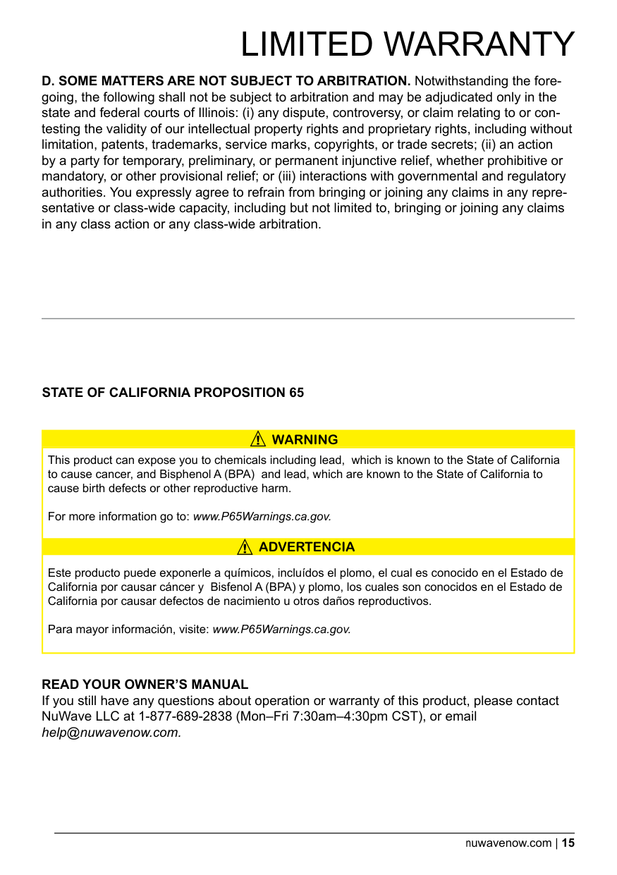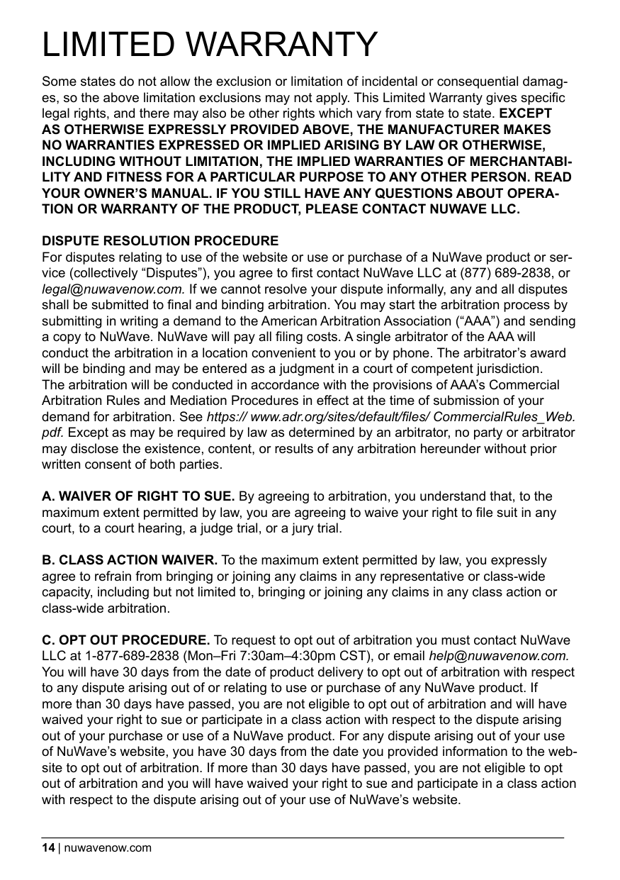 For disputes relating to use of the website or use or purchase of a NuWave product or ser- vice (collectively “Disputes”), you agree to first contact NuWave LLC at (877) 689-2838, or [email protected]. If we cannot resolve your dispute informally, any and all disputes shall be submitted to final and binding arbitration. You may start the arbitration process by submitting in writing a demand to the American Arbitration Association (“AAA”) and sending a copy to NuWave. NuWave will pay all filing costs. A single arbitrator of the AAA will conduct the arbitration in a location convenient to you or by phone. The arbitrator’s award will be binding and may be entered as a judgment in a court of competent jurisdiction. The arbitration will be conducted in accordance with the provisions of AAA’s Commercial Arbitration Rules and Mediation Procedures in effect at the time of submission of your demand for arbitration. See https:// www.adr.org/sites/default/files/ CommercialRules_Web. pdf. Except as may be required by law as determined by an arbitrator, no party or arbitrator may disclose the existence, content, or results of any arbitration hereunder without prior written consent of both parties. A. WAIVER OF RIGHT TO SUE. By agreeing to arbitration, you understand that, to the maximum extent permitted by law, you are agreeing to waive your right to file suit in any court, to a court hearing, a judge trial, or a jury trial. B. CLASS ACTION WAIVER. To the maximum extent permitted by law, you expressly agree to refrain from bringing or joining any claims in any representative or class-wide capacity, including but not limited to, bringing or joining any claims in any class action or class-wide arbitration. C. OPT OUT PROCEDURE. To request to opt out of arbitration you must contact NuWave LLC at 1-877-689-2838 (Mon–Fri 7:30am–4:30pm CST), or email [email protected]. You will have 30 days from the date of product delivery to opt out of arbitration with respect to any dispute arising out of or relating to use or purchase of any NuWave product. If more than 30 days have passed, you are not eligible to opt out of arbitration and will have waived your right to sue or participate in a class action with respect to the dispute arising out of your purchase or use of a NuWave product. For any dispute arising out of your use of NuWave’s website, you have 30 days from the date you provided information to the web- site to opt out of arbitration. If more than 30 days have passed, you are not eligible to opt out of arbitration and you will have waived your right to sue and participate in a class action with respect to the dispute arising out of your use of NuWave’s website.nuwavenow.com | 15