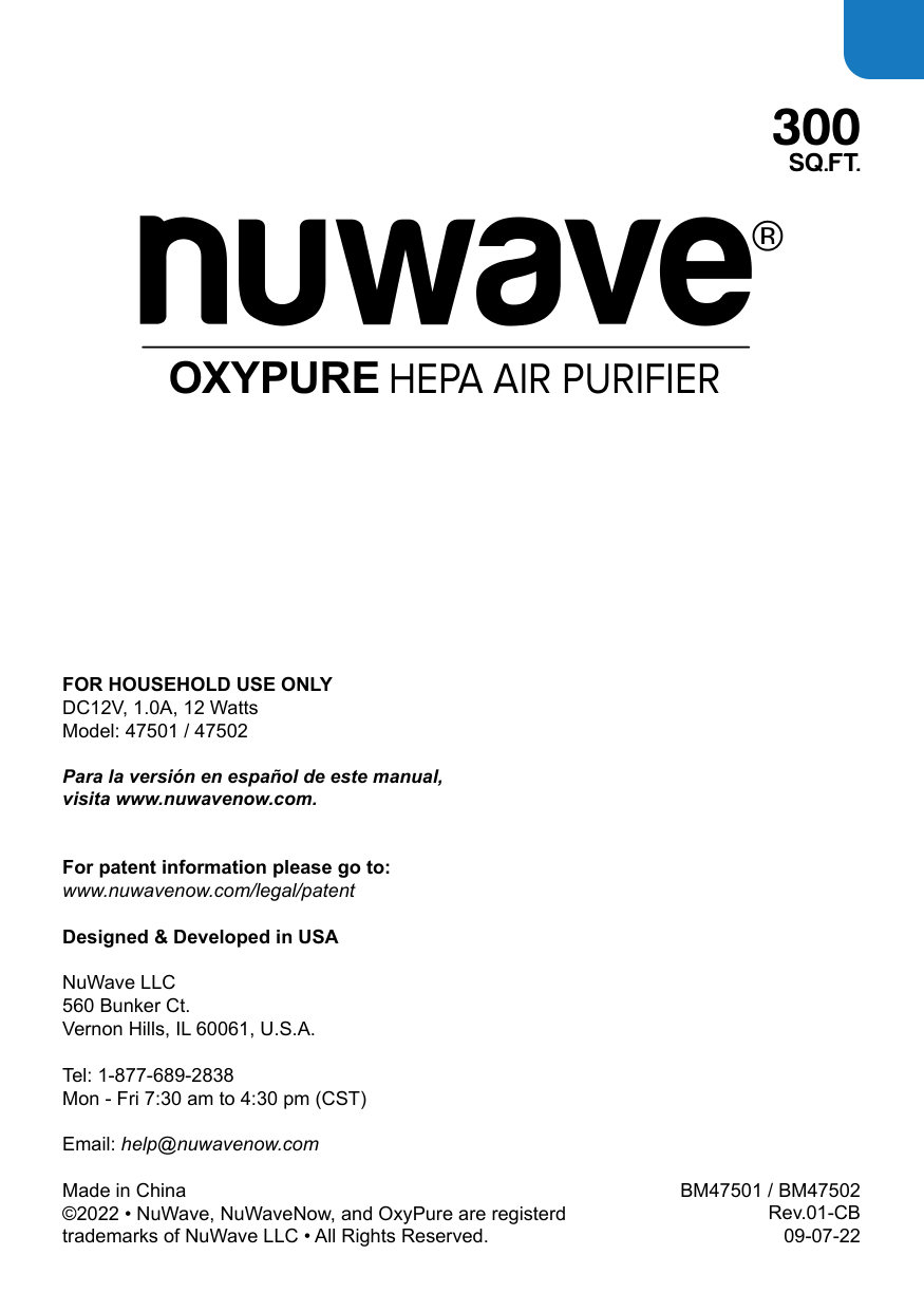 Phone: 1-877-689-2838 (Mon–Fri 7:30am–4:30pm CST) Email: [email protected]. Welcome to the NuWave® Family! Congratulations on getting your new NuWave OxyPure HEPA 300 Air Purifier! We are incredibly excited for you to enjoy pure, clean air in your home and want to make sure you get the most out of your OxyPure® experience. That’s what this manual is all about. In it, we have provided detailed operating and care instructions covering every aspect of your new air purifier to make sure the OxyPure is meeting your needs. Here at NuWave, the relationship we have with our customers only begins with the purchase. We are with you every step of the way because we are dedicated to making your experience as easy and rewarding as possible. So, if you have any questions, comments, or concerns, please don’t hesitate to contact Customer Service by calling 1-877-689-2838 (Mon–Fri 7:30am–4:30pm CST) or emailing us at [email protected]. We’re glad you’re with us, and we know that you will be, too! Connect with Us! #nuwavenow Visit nuwavenow.com to see other great products and accessories. Trademark & Copyright Notice NuWave, NuWaveNow, and OxyPure are registerd trademarks of NuWave, LLC. All Rights Reserved.nuwavenow.com | 3