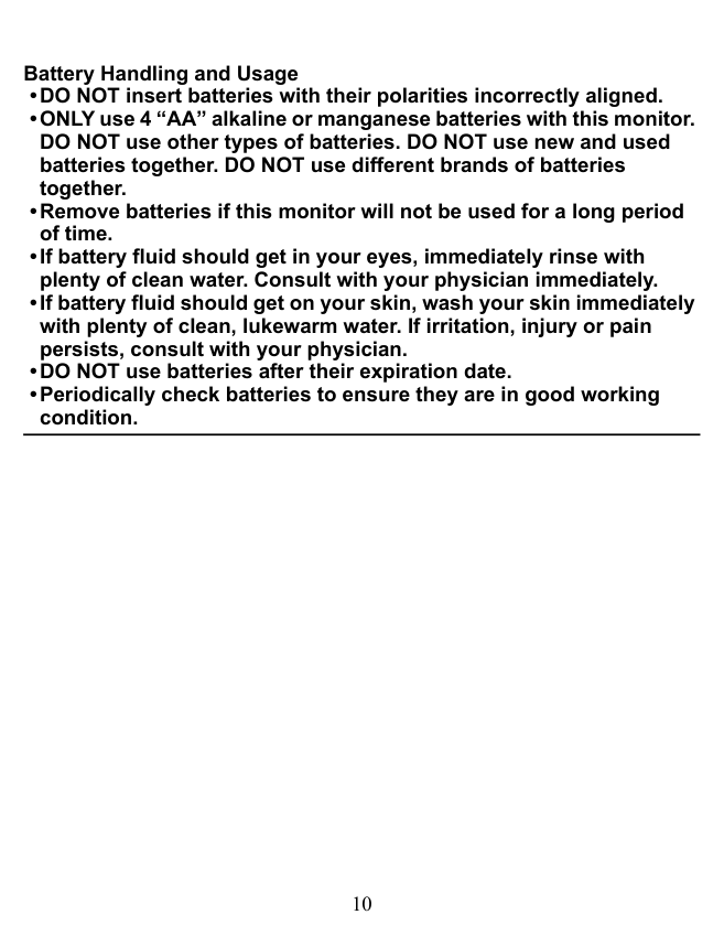 10 Battery Handling and Usage •DO NOT insert batteries with their polarities incorrectly aligned. •ONLY use 4 “AA” alkaline or manganese batteries with this monitor. DO NOT use other types of batteries. DO NOT use new and used batteries together. DO NOT use different brands of batteries together. •Remove batteries if this monitor will not be used for a long period of time. •If battery fluid should get in your eyes, immediately rinse with plenty of clean water. Consult with your physician immediately. •If battery fluid should get on your skin, wash your skin immediately with plenty of clean, lukewarm water. If irritation, injury or pain persists, consult with your physician. •DO NOT use batteries after their expiration date. •Periodically check batteries to ensure they are in good working condition.