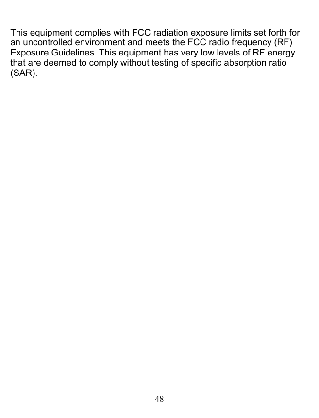 Changes or modifications not expressly approved by the party responsible for compliance could void the user's authority to operate the equipment. This device complies with part 15 of the FCC Rules. Operation is subject to the following two conditions: (1) This device may not cause harmful interference, and (2) this device must accept any interference received, including interference that may cause undesired operation. Note •This equipment has been tested and found to comply with the limits for a Class B digital device, pursuant to part 15 of the FCC Rules. These limits are designed to provide reasonable protection against harmful interference in a residential installation. This equipment generates, uses and can radiate radio frequency energy and, if not installed and used in accordance with the instructions, may cause harmful interference to radio communications. However, there is no guarantee that interference will not occur in a particular installation. If this equipment does cause harmful interference to radio or television reception, which can be determined by turning the equipment off and on, the user is encouraged to try to correct the interference by one or more of the following measures: This transmitter must not be co-located or operated in conjunction with any other antenna or transmitter. •Reorient or relocate the receiving antenna. •Increase the separation between the equipment and receiver. •Connect the equipment into an outlet on a circuit different from that to which the receiver is connected. •Consult the dealer or an experienced radio/TV technician for help.48 This equipment complies with FCC radiation exposure limits set forth for an uncontrolled environment and meets the FCC radio frequency (RF) Exposure Guidelines. This equipment has very low levels of RF energy that are deemed to comply without testing of specific absorption ratio