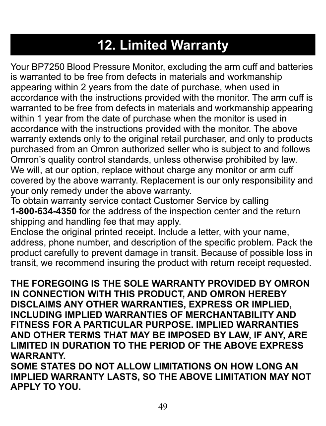 The BP7250 monitor is warranted to be free from defects in materials and workmanship for 2 years from the date of purchase when used according to the instructions. The arm cuff carries a shorter warranty of 1 year from the date of purchase. The warranty extends only to the original retail purchaser from an Omron authorized seller, and Omron's remedy is to replace the defective product at no charge. Contact customer service at 1-800-634-4350 to obtain warranty service. (Page 49)