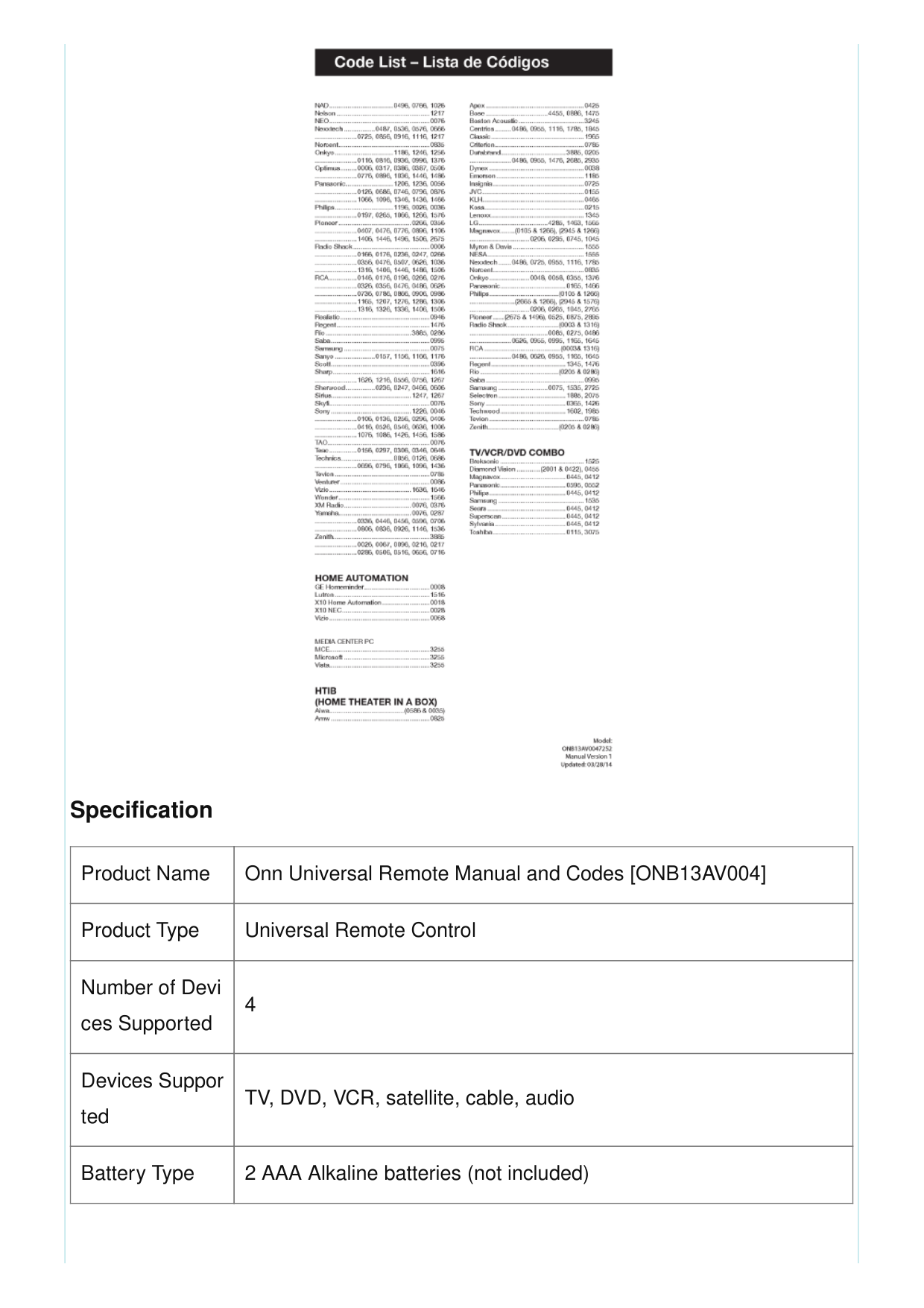 Code ListSpecification Product Name Onn Universal Remote Manual and Codes [ONB13AV004] Product Type Universal Remote Control Number of Devi ces Supported 4 Devices Suppor ted TV, DVD, VCR, satellite, cable, audio Battery Type 2 AAA Alkaline batteries (not included)