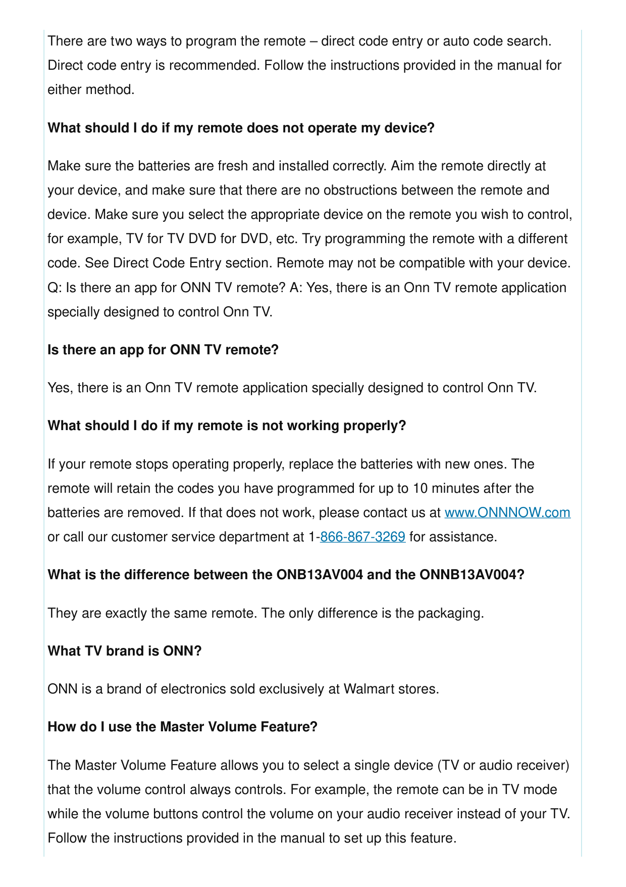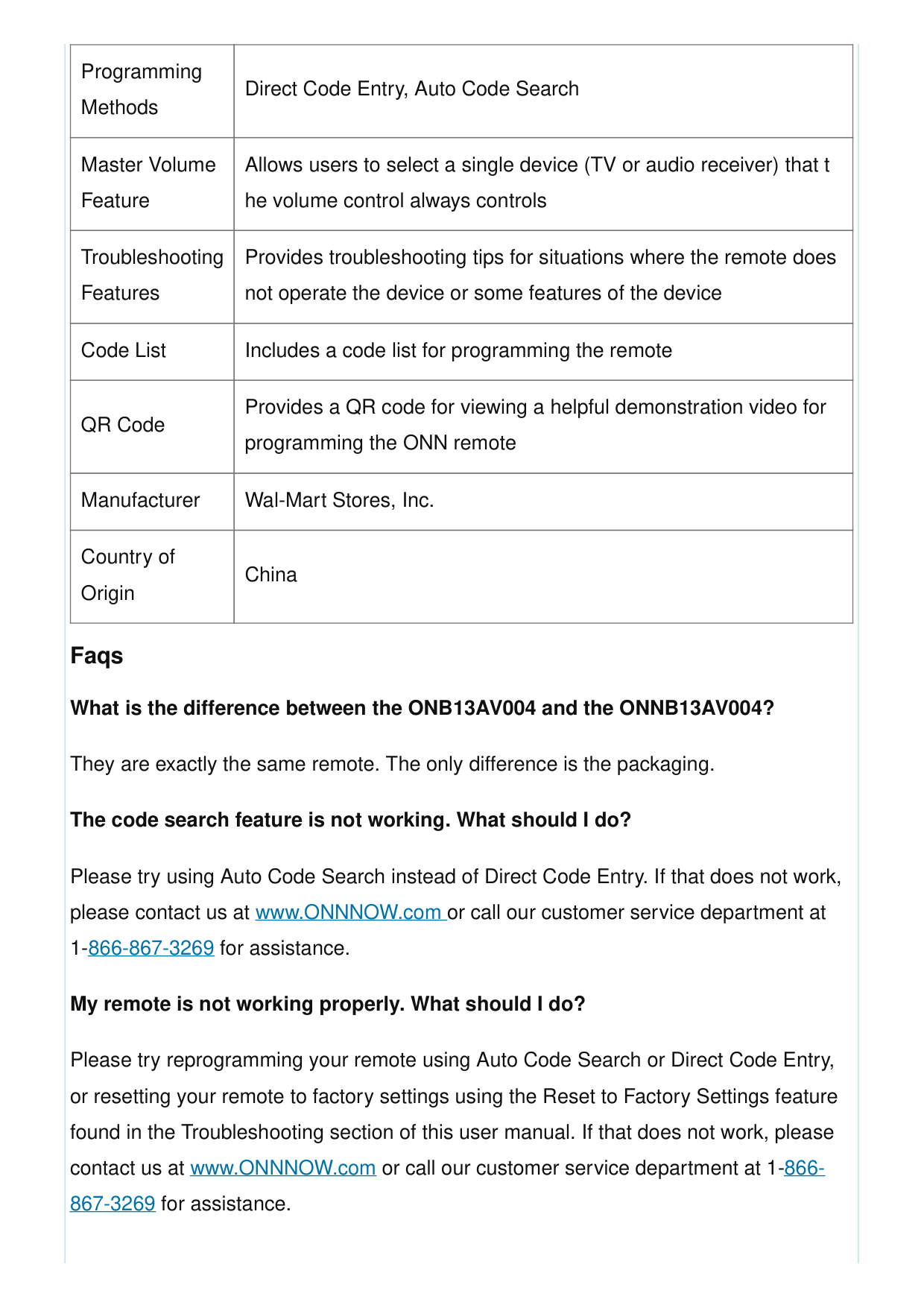 Programming Methods Direct Code Entry, Auto Code Search Master Volume Feature Allows users to select a single device (TV or audio receiver) that t he volume control always controls Troubleshooting Features Provides troubleshooting tips for situations where the remote does not operate the device or some features of the device Code List Includes a code list for programming the remote QR Code Provides a QR code for viewing a helpful demonstration video for programming the ONN remote Manufacturer Wal-Mart Stores, Inc. Country of Origin China Faqs What is the difference between the ONB13AV004 and the ONNB13AV004? They are exactly the same remote. The only difference is the packaging. The code search feature is not working. What should I do? Please try using Auto Code Search instead of Direct Code Entry. If that does not work, please contact us at www.ONNNOW.com or call our customer service department at 1-866-867-3269 for assistance. My remote is not working properly. What should I do? Please try reprogramming your remote using Auto Code Search or Direct Code Entry, or resetting your remote to factory settings using the Reset to Factory Settings feature found in the Troubleshooting section of this user manual. If that does not work, please contact us at www.ONNNOW.com or call our customer service department at 1-866- 867-3269 for assistance.