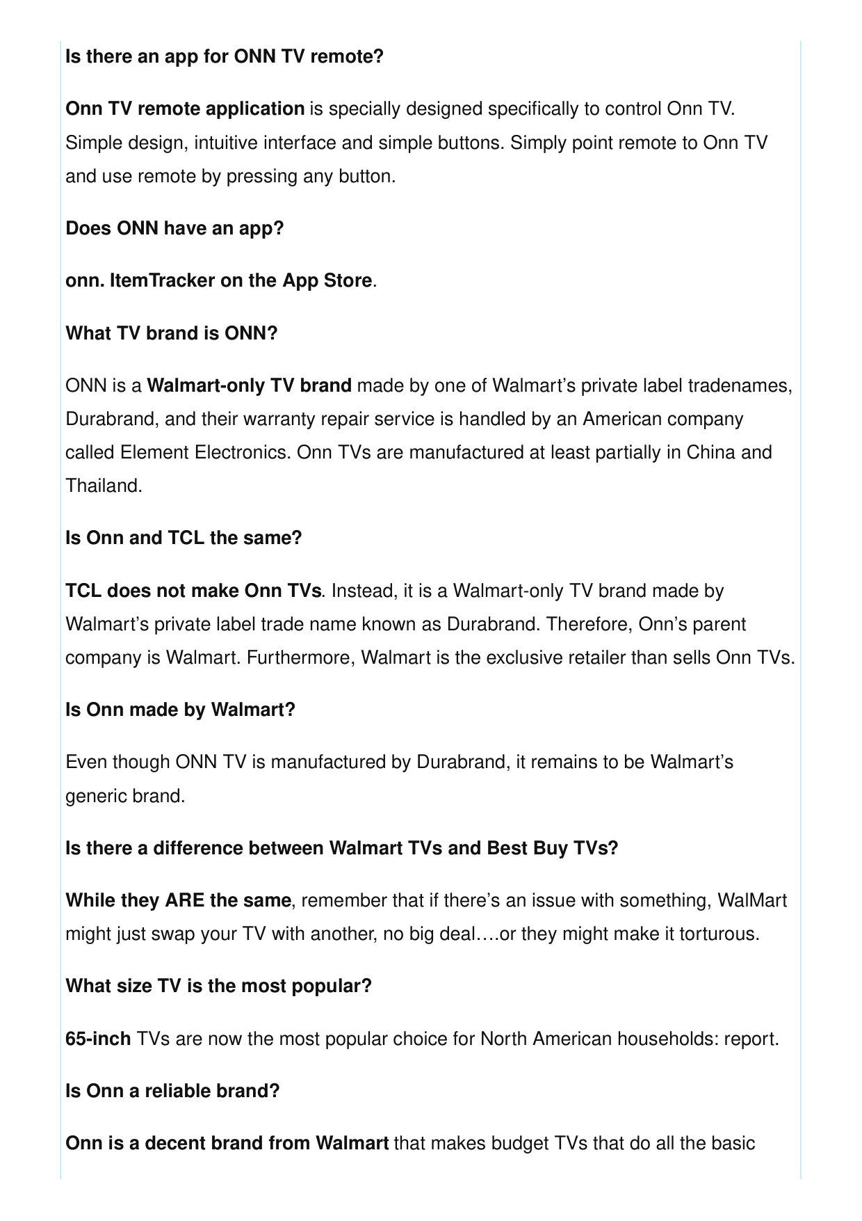 Is there an app for ONN TV remote? Onn TV remote application is specially designed specifically to control Onn TV. Simple design, intuitive interface and simple buttons. Simply point remote to Onn TV and use remote by pressing any button. Does ONN have an app? onn. ItemTracker on the App Store. What TV brand is ONN? ONN is a Walmart-only TV brand made by one of Walmart’s private label tradenames, Durabrand, and their warranty repair service is handled by an American company called Element Electronics. Onn TVs are manufactured at least partially in China and Thailand. Is Onn and TCL the same? TCL does not make Onn TVs. Instead, it is a Walmart-only TV brand made by Walmart’s private label trade name known as Durabrand. Therefore, Onn’s parent company is Walmart. Furthermore, Walmart is the exclusive retailer than sells Onn TVs. Is Onn made by Walmart? Even though ONN TV is manufactured by Durabrand, it remains to be Walmart’s generic brand. Is there a difference between Walmart TVs and Best Buy TVs? While they ARE the same, remember that if there’s an issue with something, WalMart might just swap your TV with another, no big deal….or they might make it torturous. What size TV is the most popular? 65-inch TVs are now the most popular choice for North American households: report. Is Onn a reliable brand? Onn is a decent brand from Walmart that makes budget TVs that do all the basic