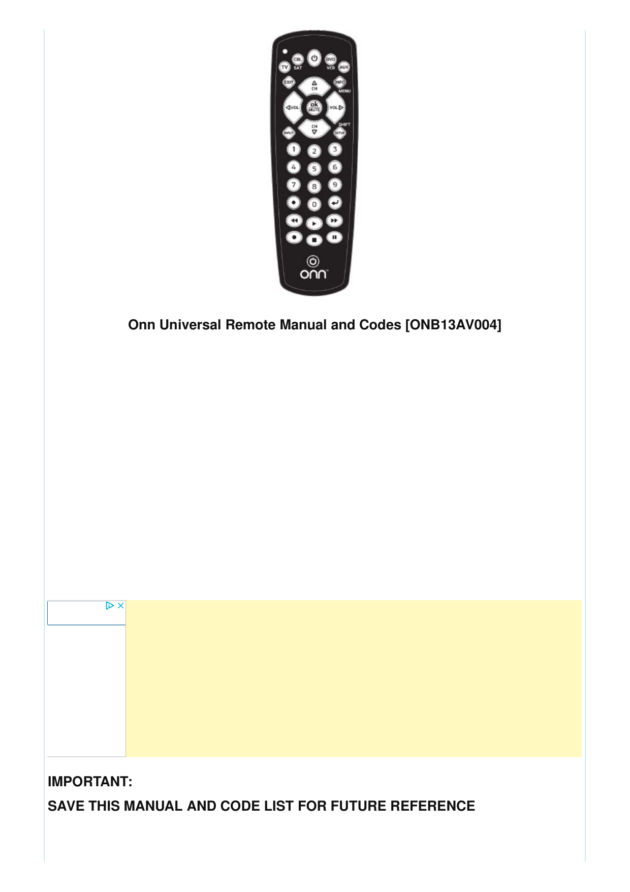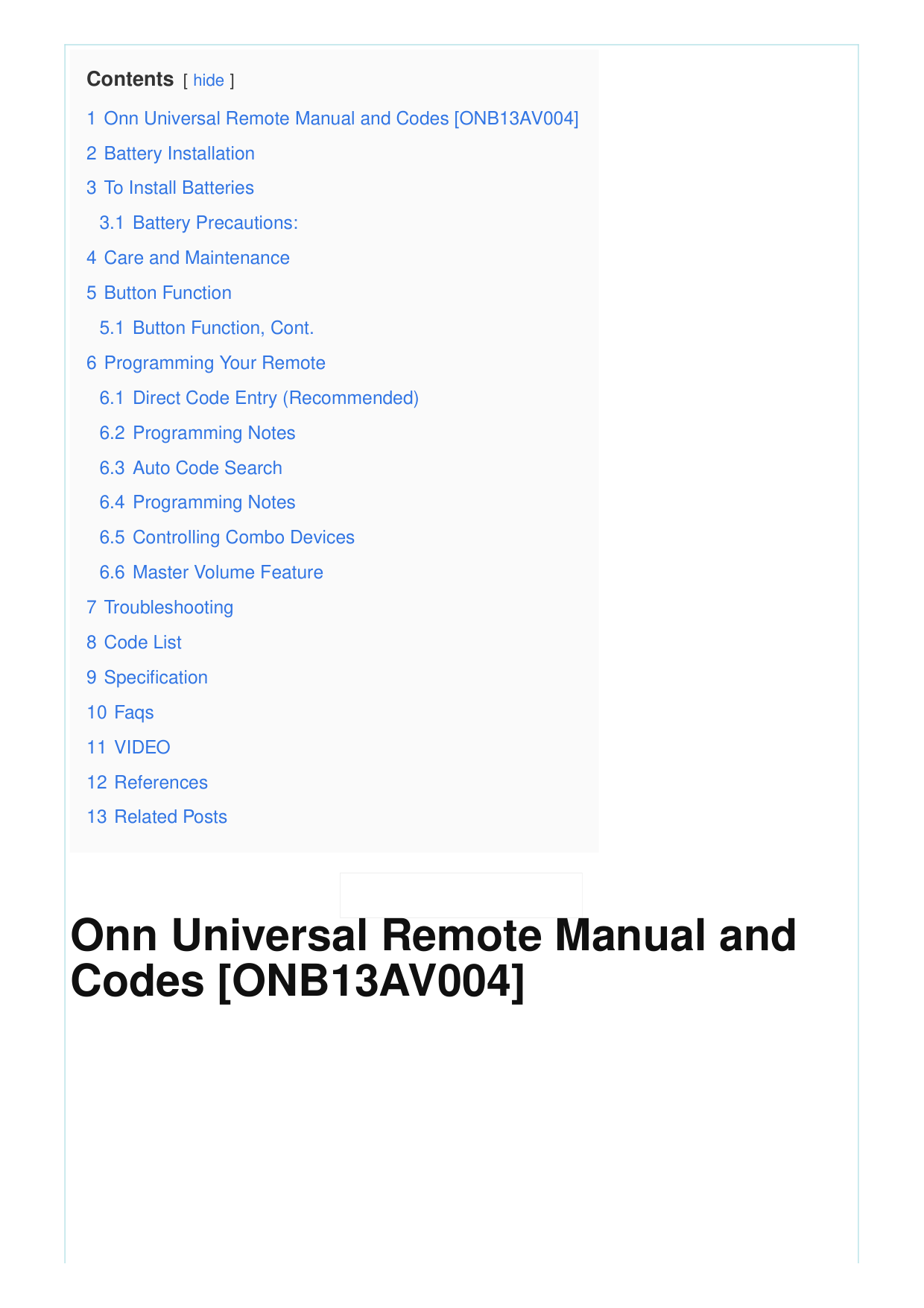 Contents [ hide ] 1 Onn Universal Remote Manual and Codes [ONB13AV004] 2 Battery Installation 3 To Install Batteries 3.1 Battery Precautions: 4 Care and Maintenance 5 Button Function 5.1 Button Function, Cont. 6 Programming Your Remote 6.1 Direct Code Entry (Recommended) 6.2 Programming Notes 6.3 Auto Code Search 6.4 Programming Notes 6.5 Controlling Combo Devices 6.6 Master Volume Feature 7 Troubleshooting 8 Code List 9 Specification 10 Faqs