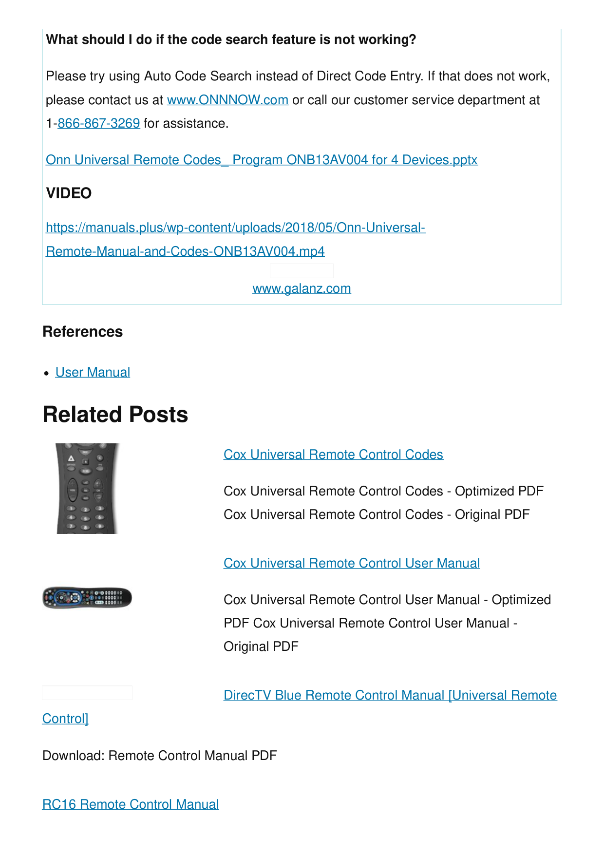 Cox Universal Remote Control Codes Cox Universal Remote Control Codes - Optimized PDF Cox Universal Remote Control Codes - Original PDF Cox Universal Remote Control User Manual Cox Universal Remote Control User Manual - Optimized PDF Cox Universal Remote Control User Manual - Original PDF DirecTV Blue Remote Control Manual [Universal Remote Control] Download: Remote Control Manual PDF RC16 Remote Control Manual What should I do if the code search feature is not working? Please try using Auto Code Search instead of Direct Code Entry. If that does not work, please contact us at www.ONNNOW.com or call our customer service department at 1-866-867-3269 for assistance. Onn Universal Remote Codes_ Program ONB13AV004 for 4 Devices.pptx