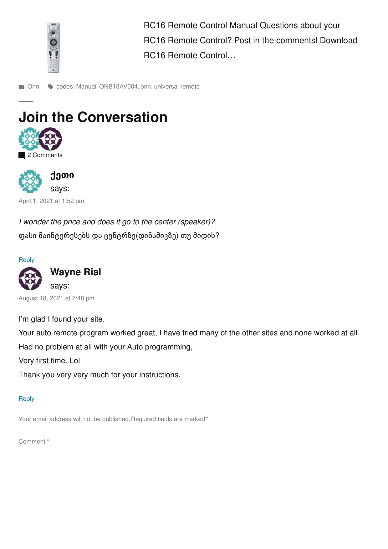 https://manuals.plus/wp-content/uploads/2018/05/Onn-Universal- Remote-Manual-and-Codes-ONB13AV004.mp4 www.galanz.com References User Manual Related PostsRC16 Remote Control Manual Questions about your RC16 Remote Control? Post in the comments! Download RC16 Remote Control… Onn codes, Manual, ONB13AV004, onn, universal remote Join the Conversation 2 Comments I wonder the price and does it go to the center (speaker)? ფასი მაინტერესებს და ცენტრზე(დინამიკზე) თუ მიდის? Reply says: April 1, 2021 at 1:52 pm ქეთი I’m glad I found your site. Your auto remote program worked great, I have tried many of the other sites and none worked at all. Had no problem at all with your Auto programming, Very first time. Lol Thank you very very much for your instructions. Reply says: August 18, 2021 at 2:48 pm Wayne Rial Your email address will not be published. Required fields are marked * Comment *